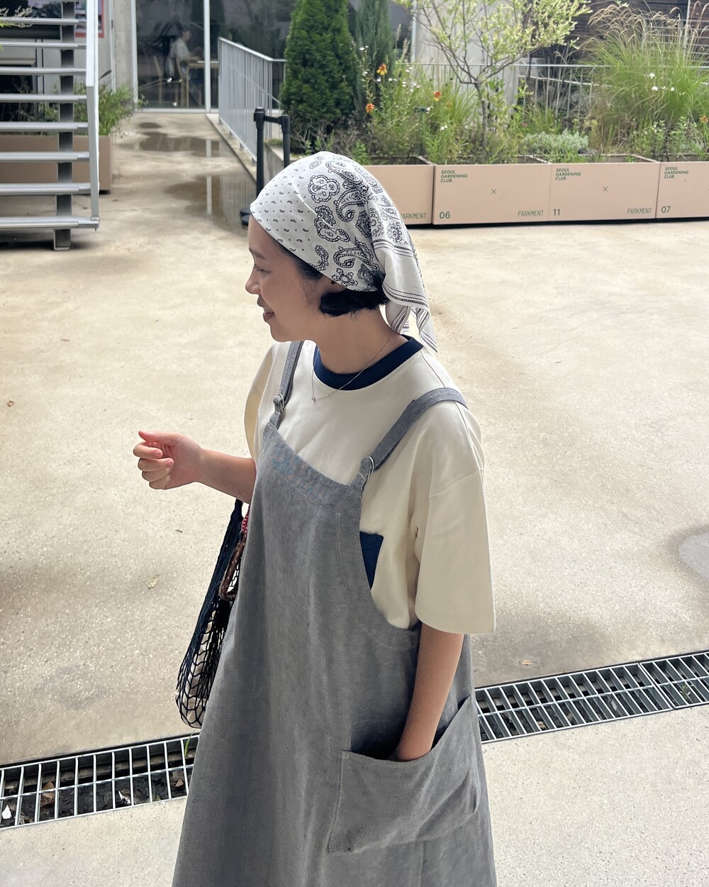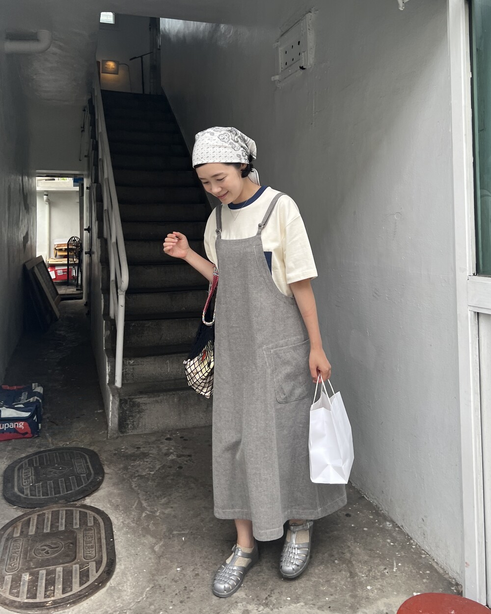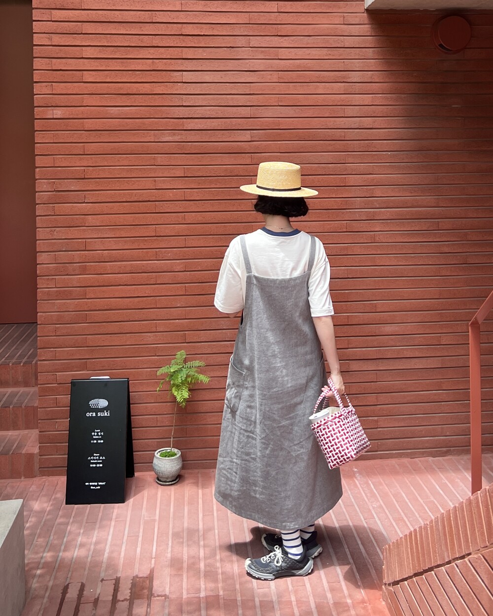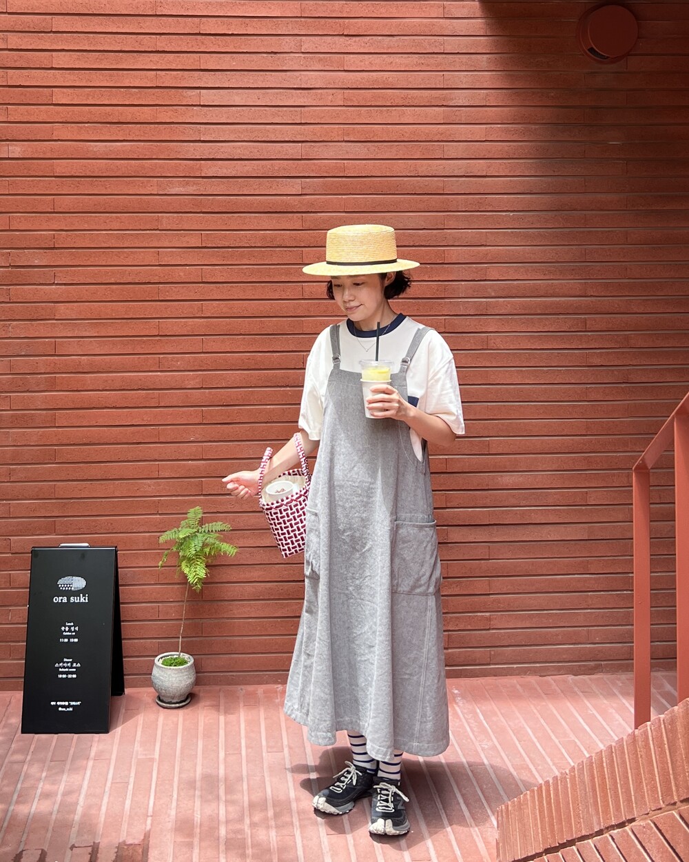 차분한 색감이죠. 리넨 오버롤 드레스와도 잘 어울려요.
