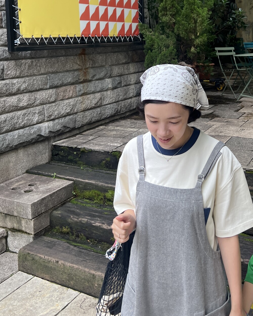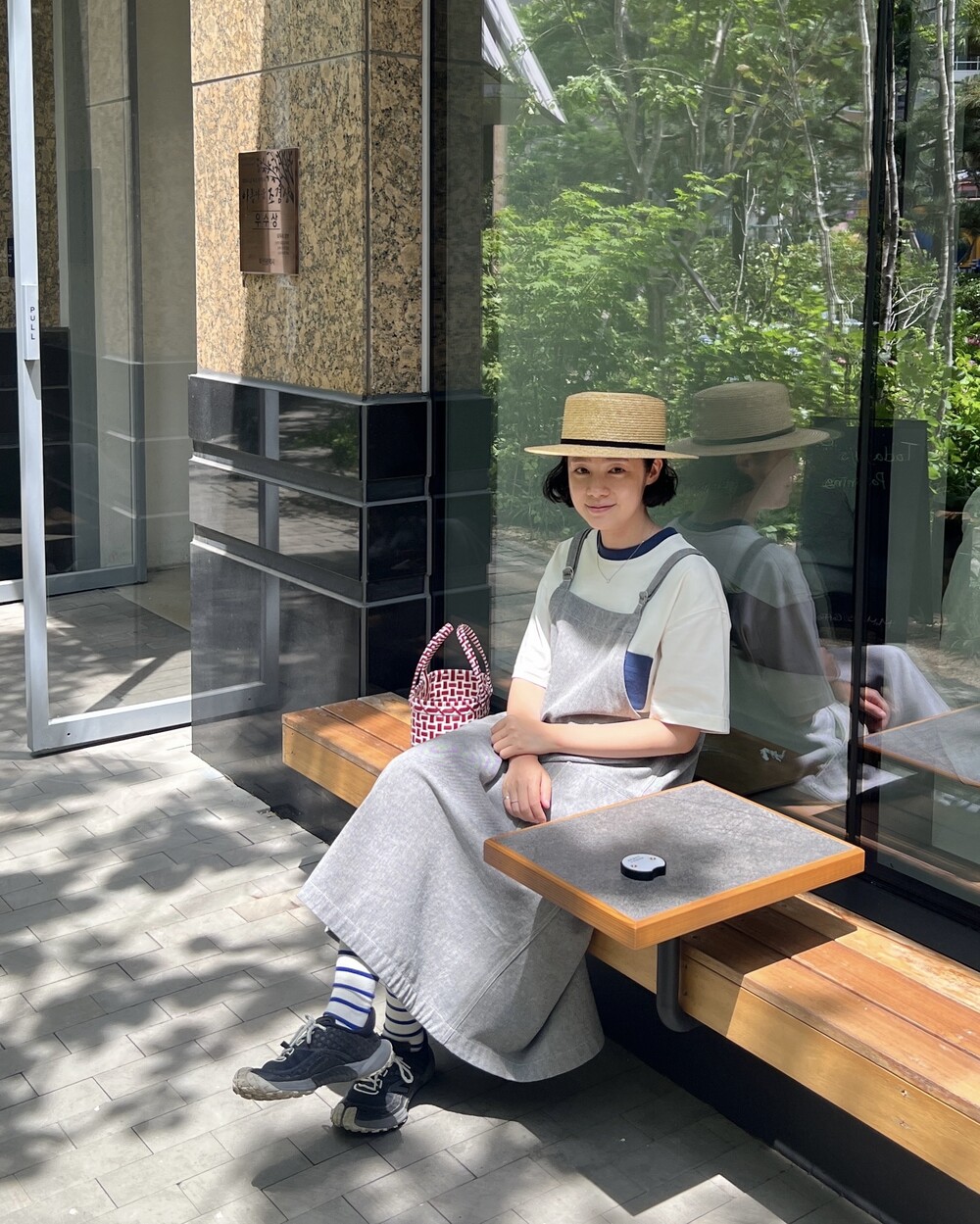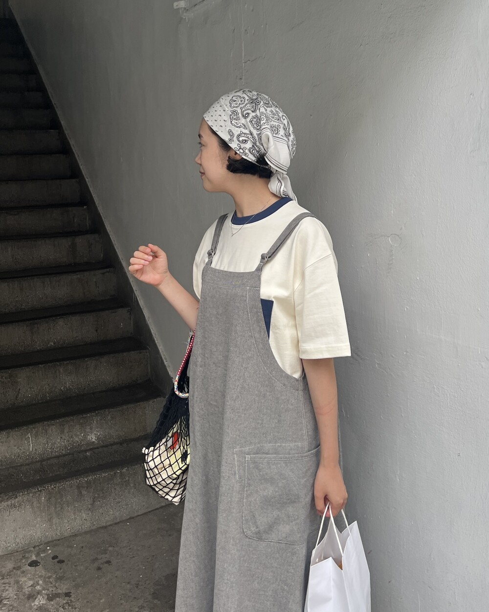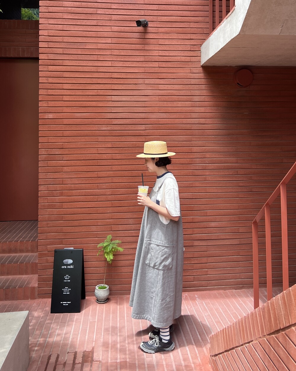 차분한 색감이죠. 리넨 오버롤 드레스와도 잘 어울려요.