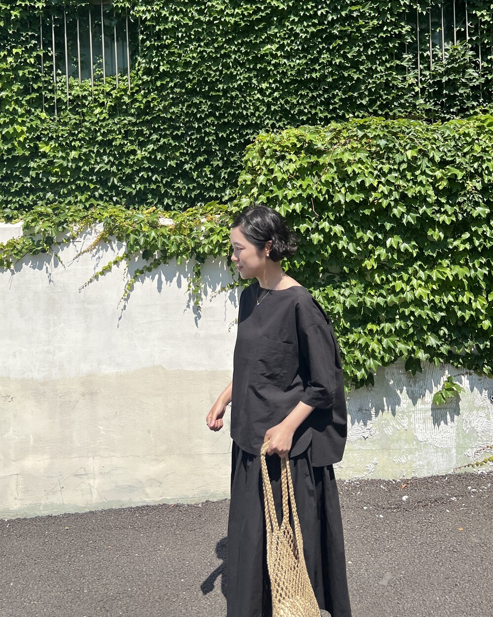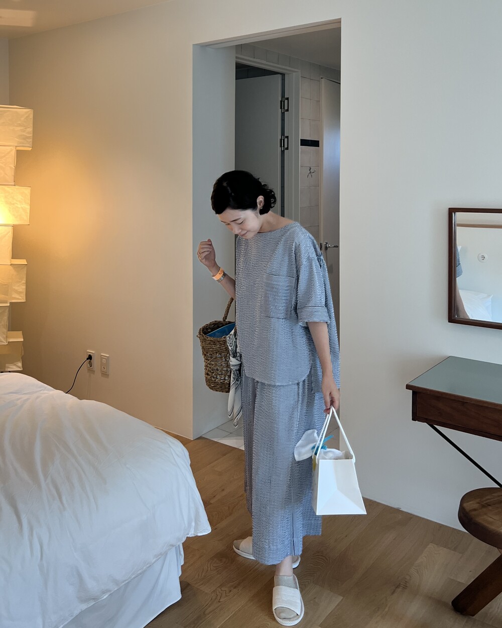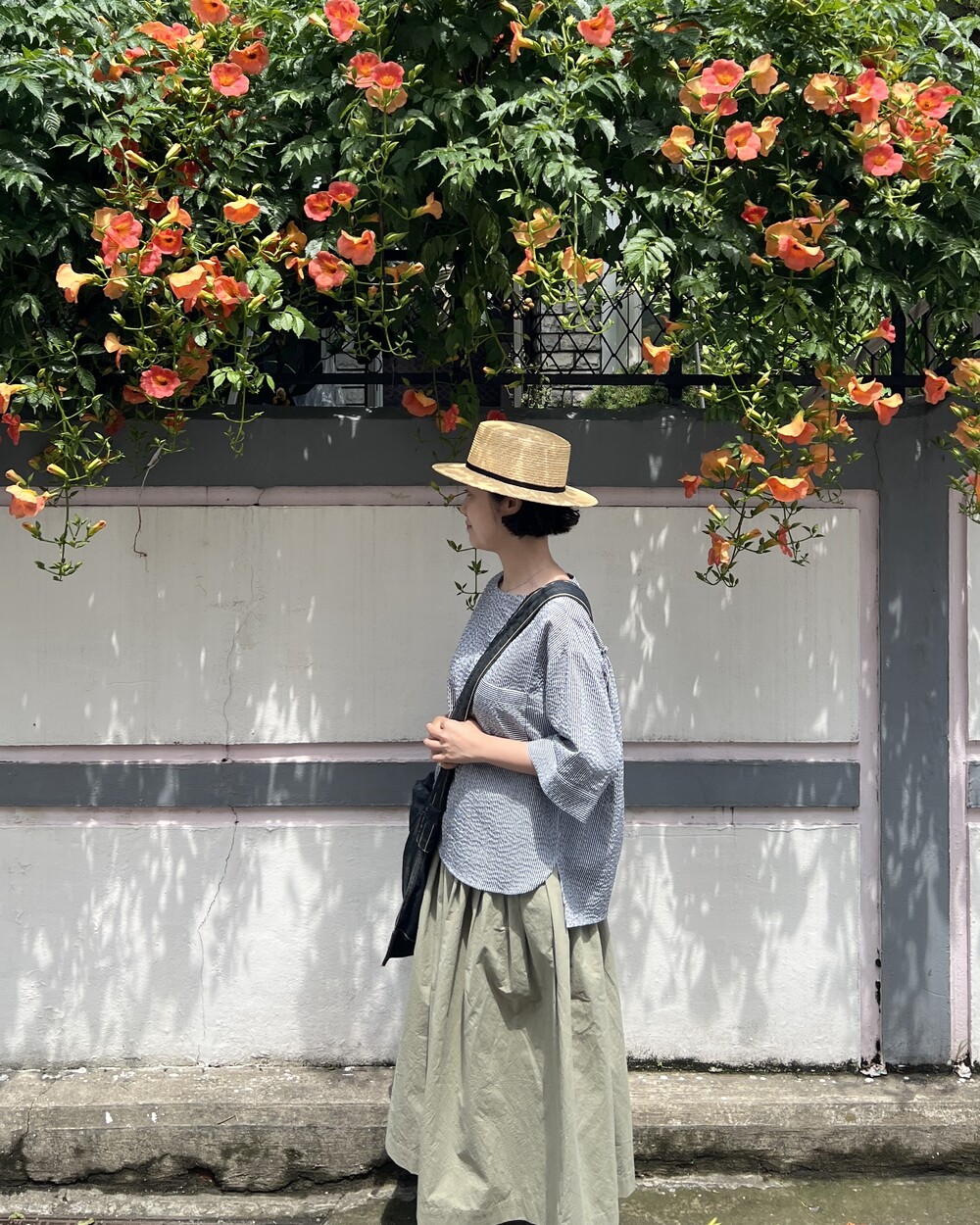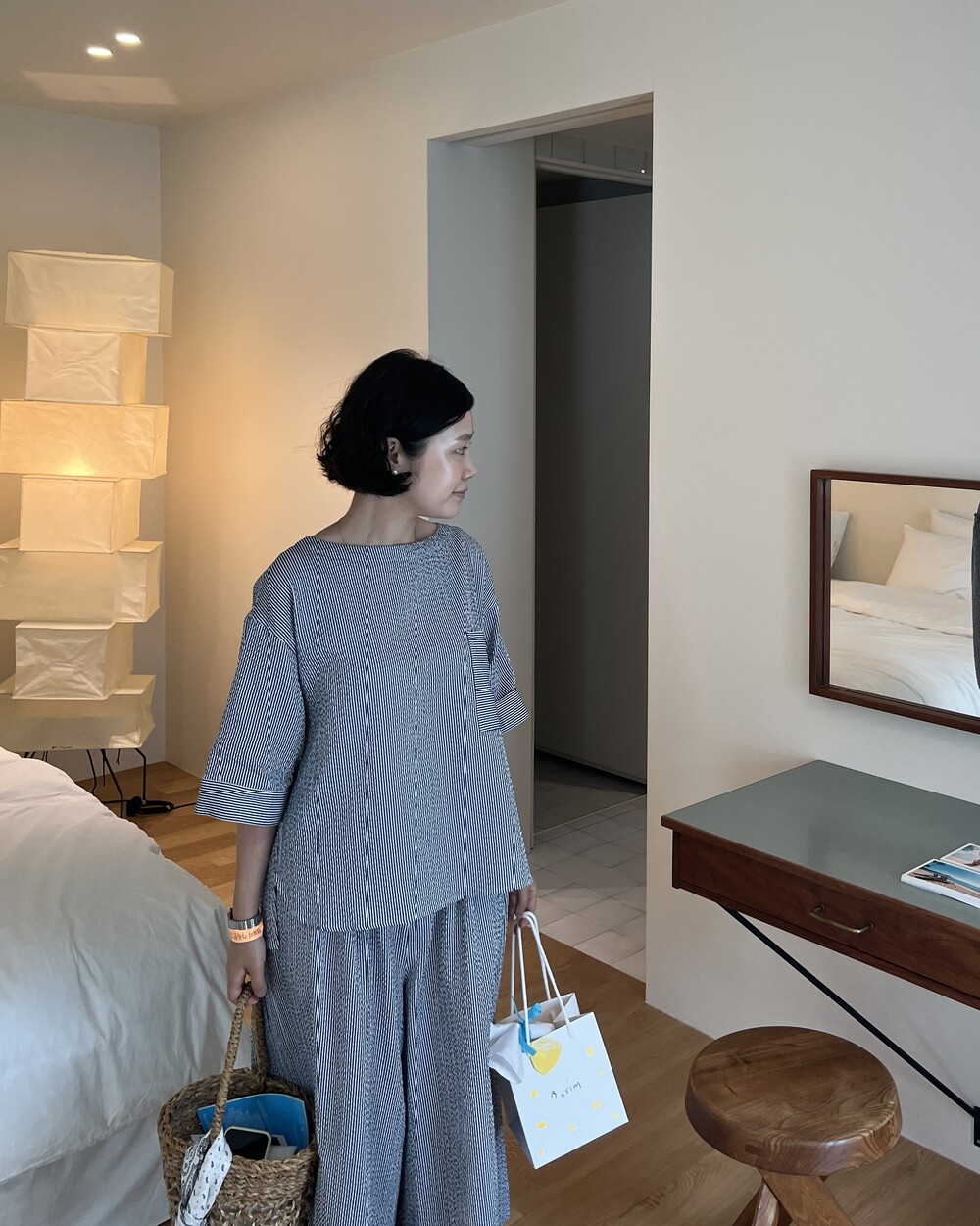 셋업으로 입기도 좋고 다른 다양한 하의와 매치하여 가벼운 외출, 여행지의 마실 룩까지 폭넓게 활용할 수 있답니다. 가벼운 리넨 팬츠나 롱스커트와 함께하면 더욱 멋스럽고요.
