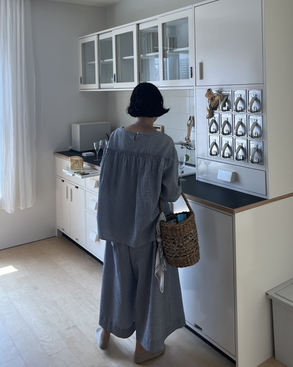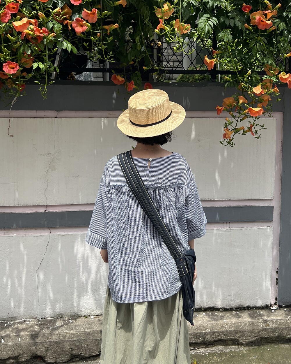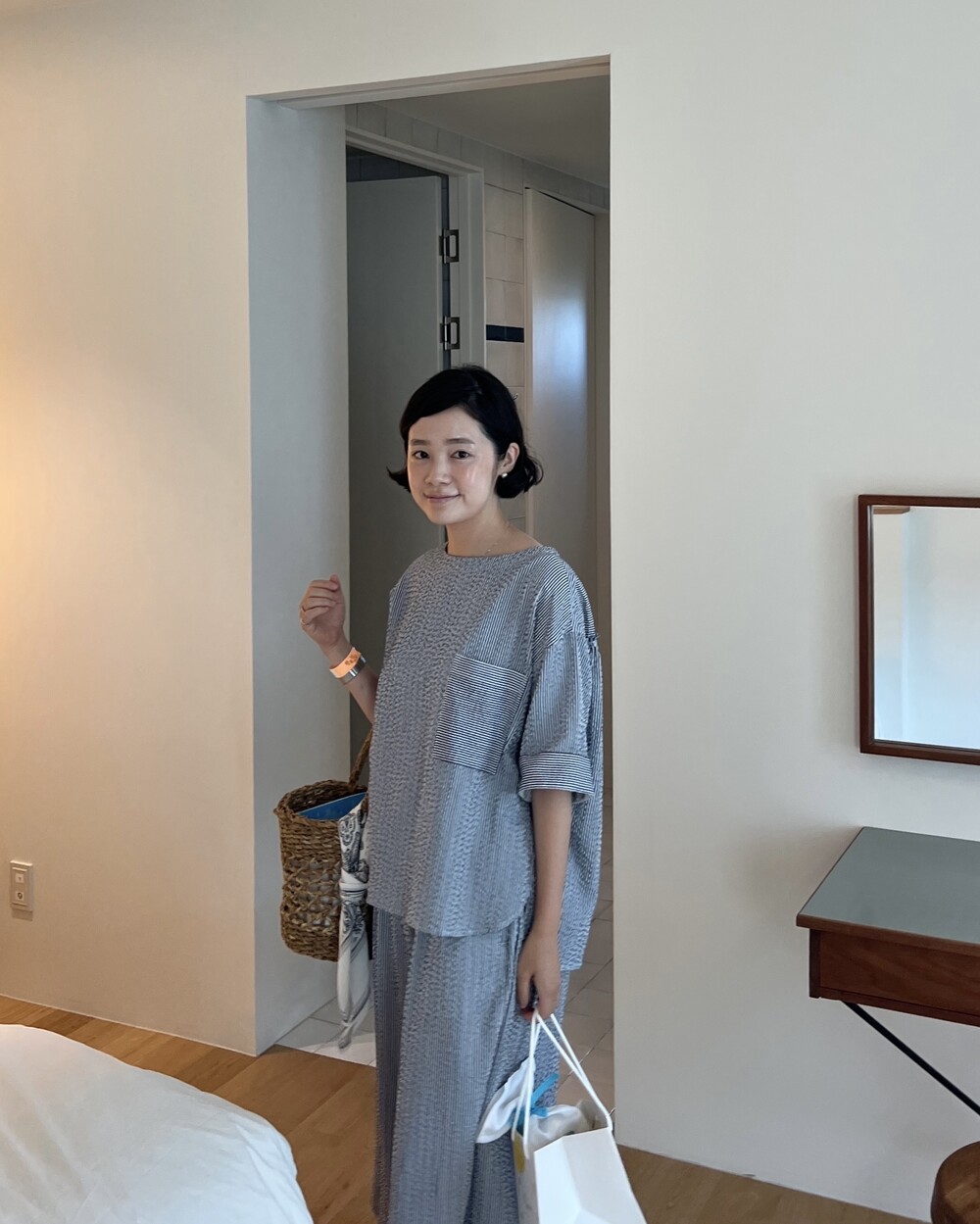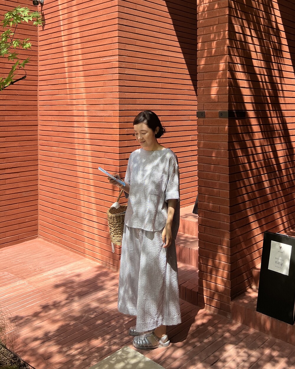 셋업으로 입기도 좋고 다른 다양한 하의와 매치하여 가벼운 외출, 여행지의 마실 룩까지 폭넓게 활용할 수 있답니다. 가벼운 리넨 팬츠나 롱스커트와 함께하면 더욱 멋스럽고요.