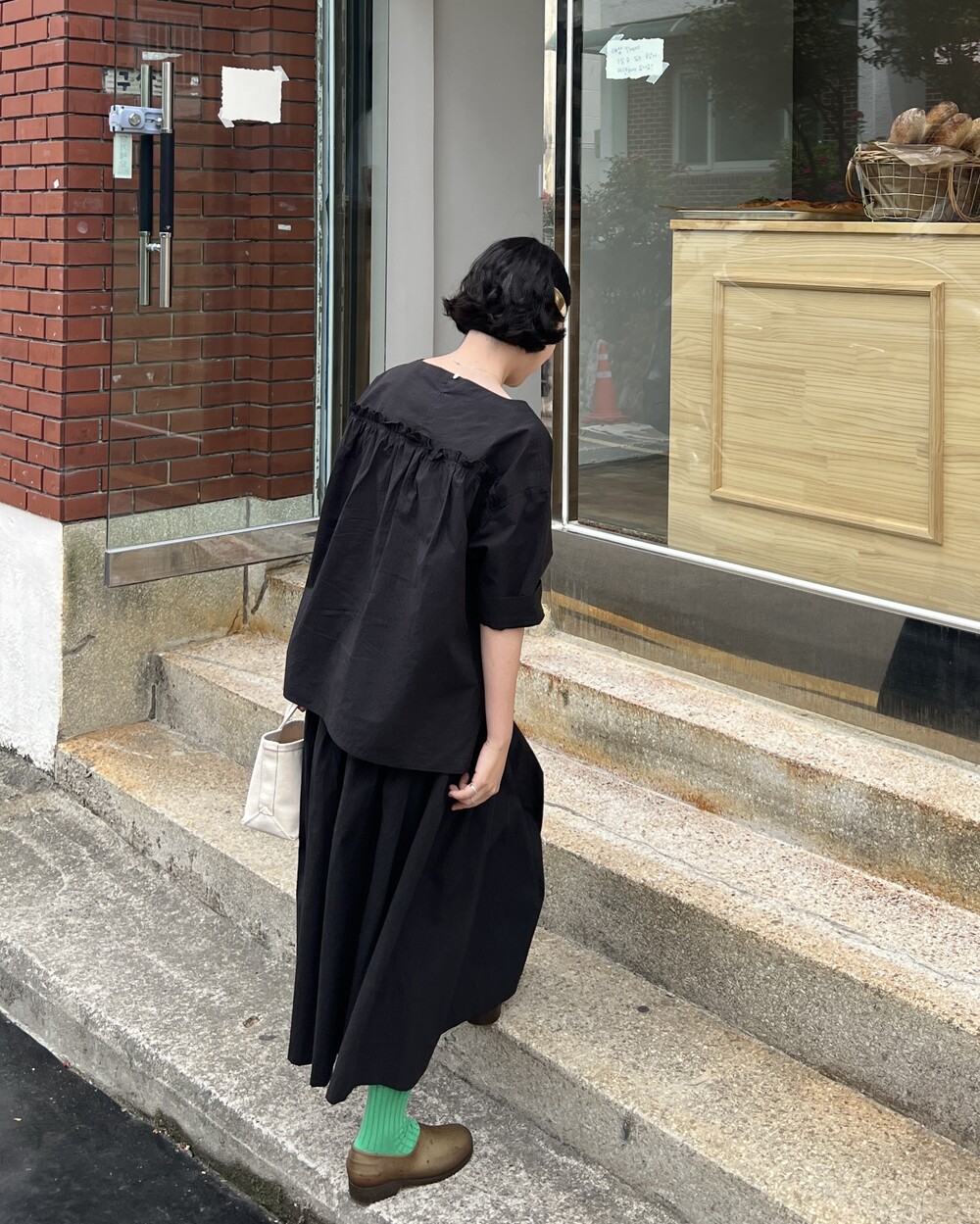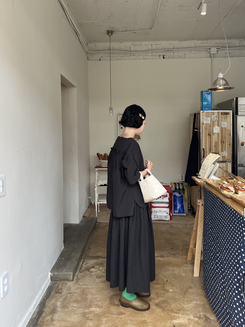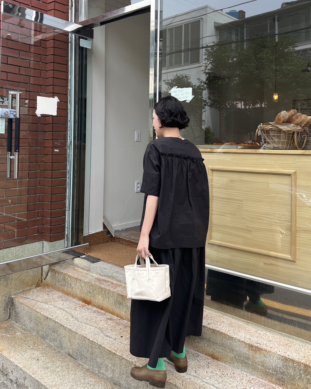 앞은 귀여운 포켓과 함께 단정한 느낌이라면 뒷면에는 섬세한 주름을 잡아주어 포인트도 되면서 사랑스러운 느낌이 있지요.