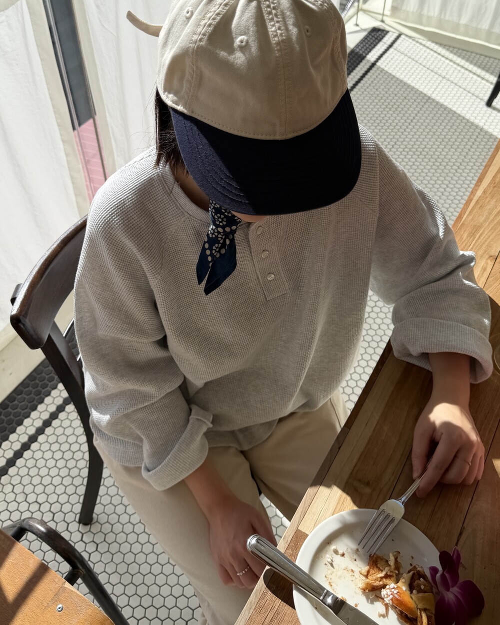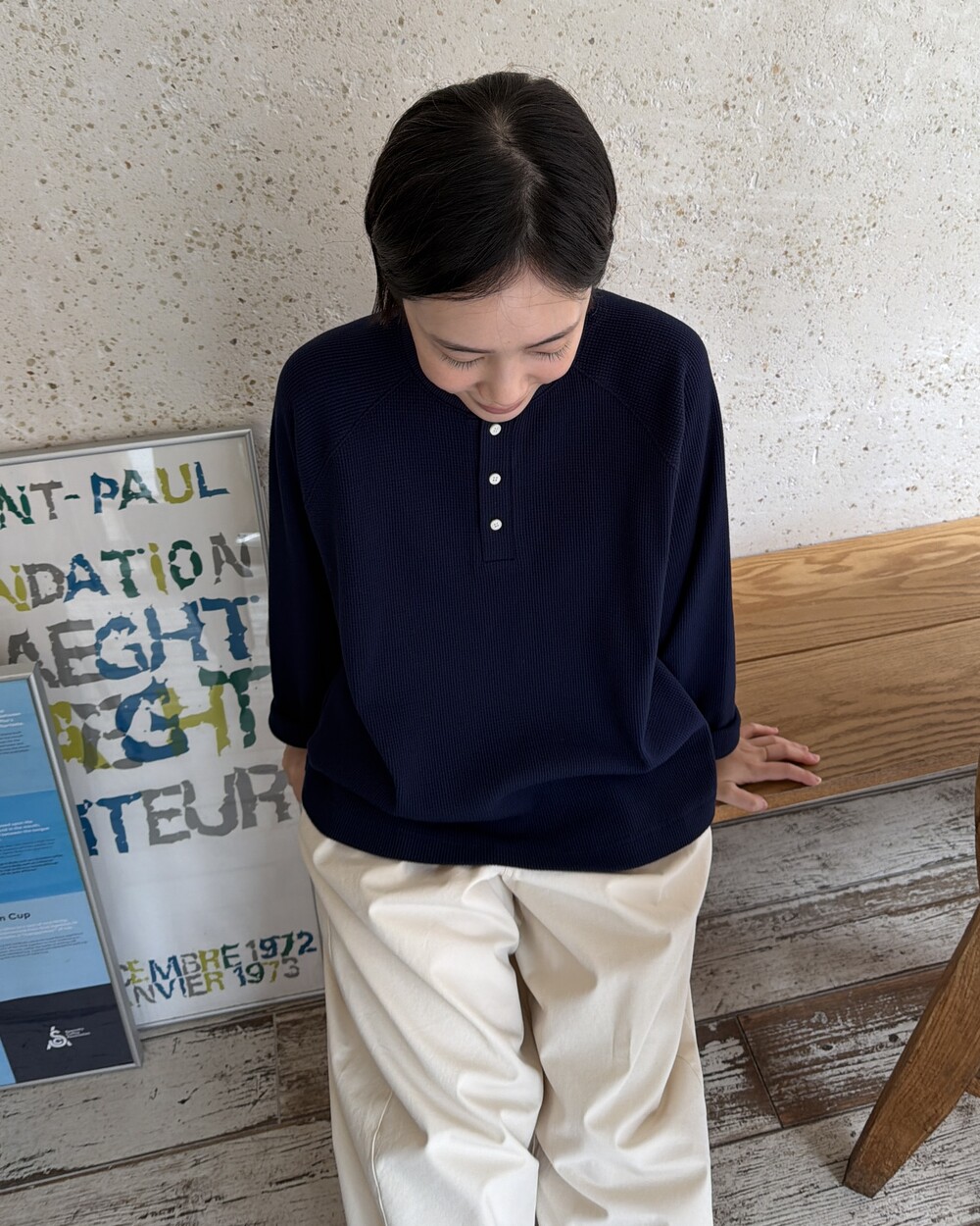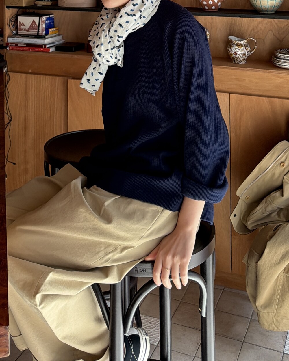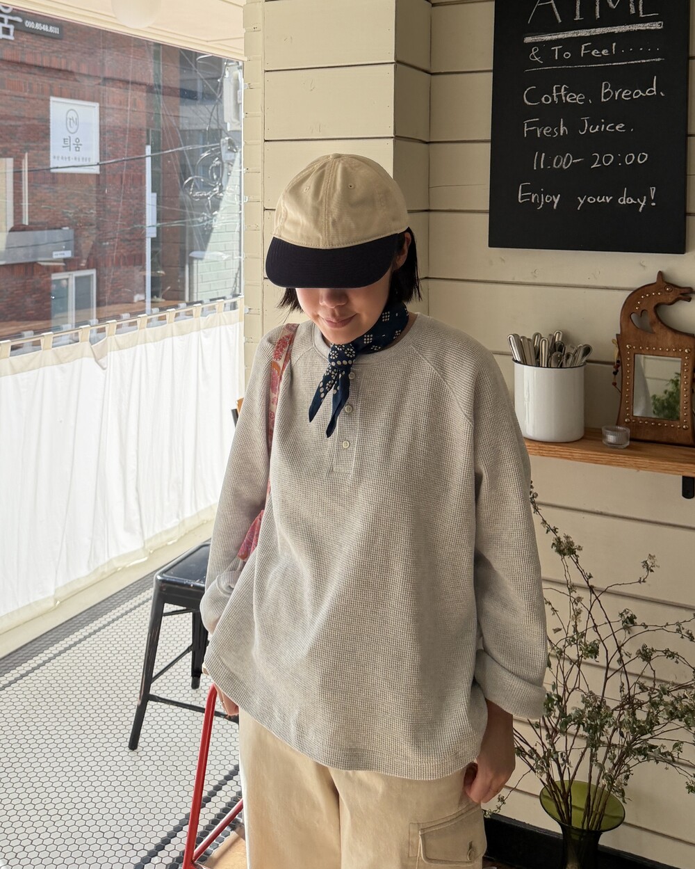 와플 조직의 소재감이 기본 티셔츠 이상의 존재감을 주어 단독 착용만으로도 완성도 있는 스타일링이 가능해요.