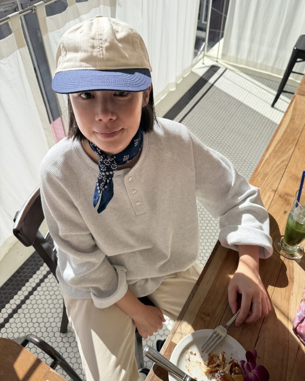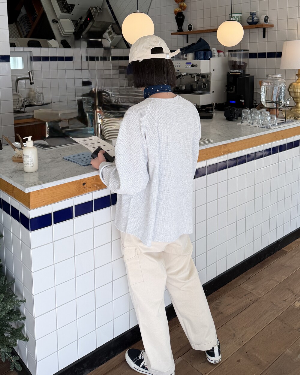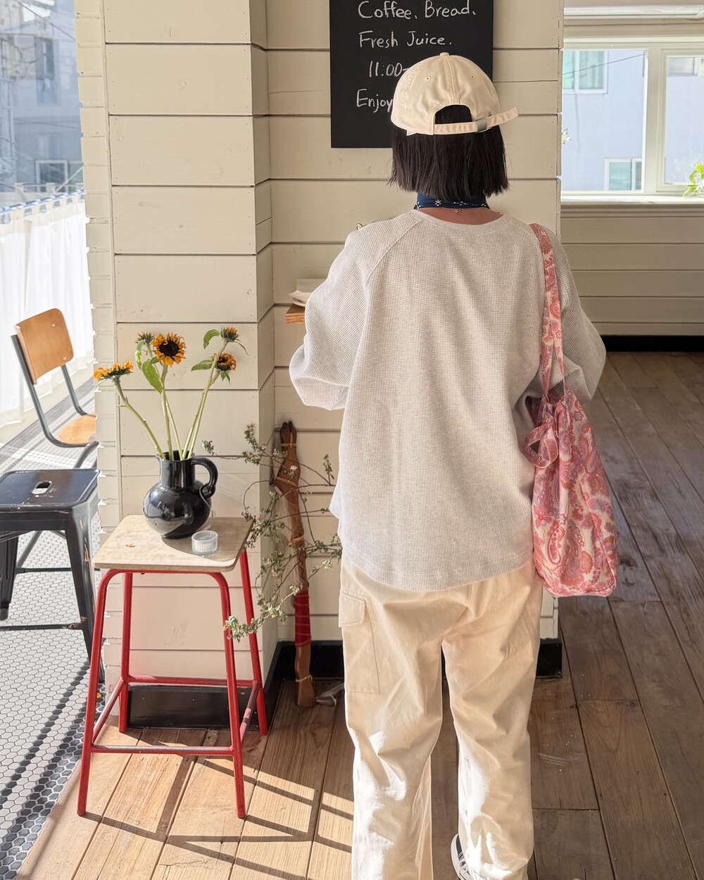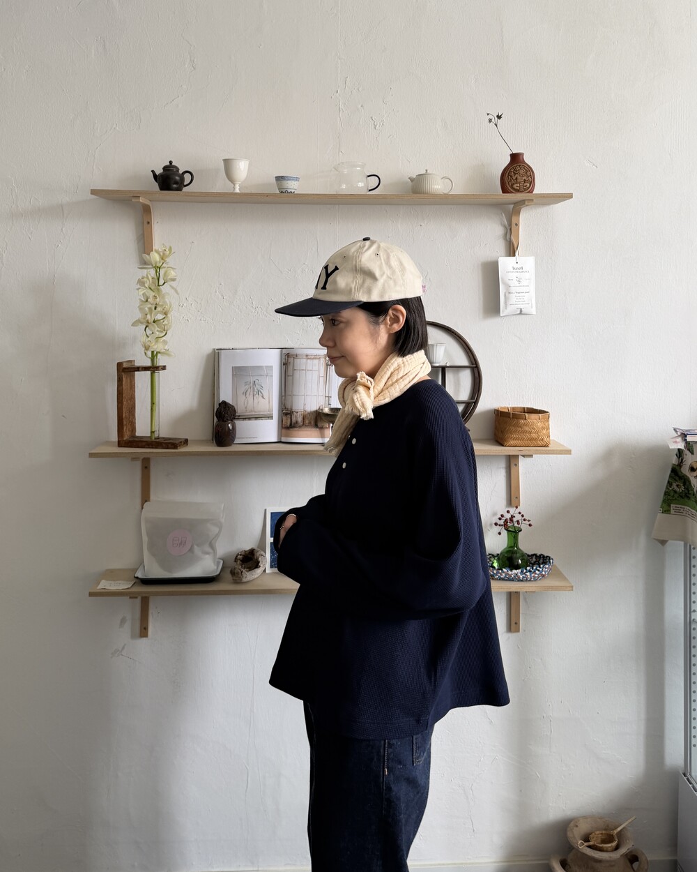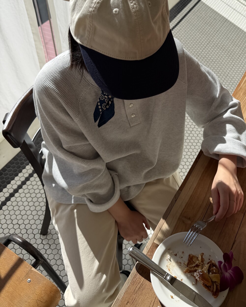 와플 조직의 소재감이 기본 티셔츠 이상의 존재감을 주어 단독 착용만으로도 완성도 있는 스타일링이 가능해요.