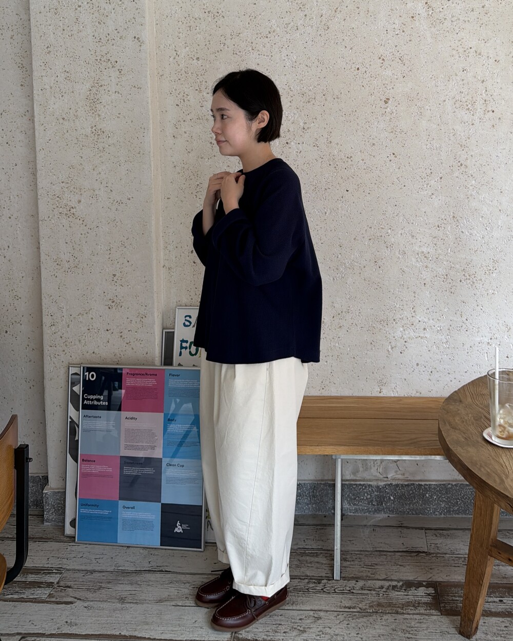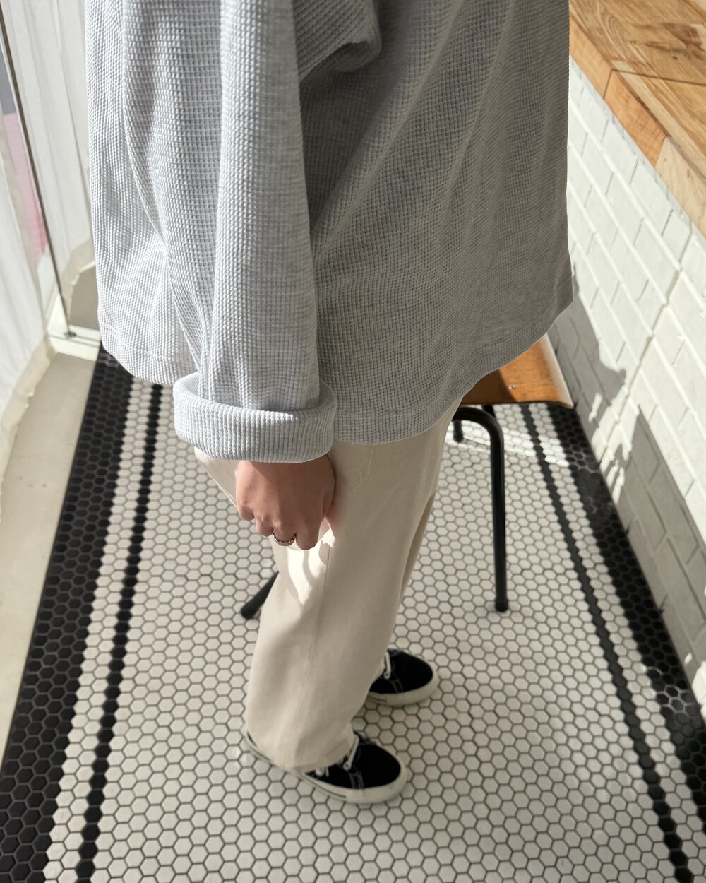 평범한 면 티셔츠와 달리 은은하게 돋보이는 와플 조직이 옷 자체에 자연스러운 포인트가 되어 꾸민 듯 안 꾸민 듯한 느낌을 내기에 좋더라고요. :-)