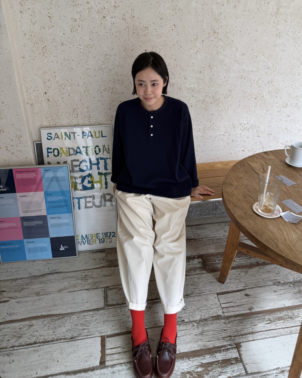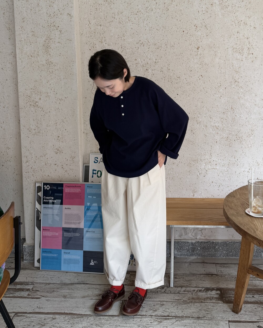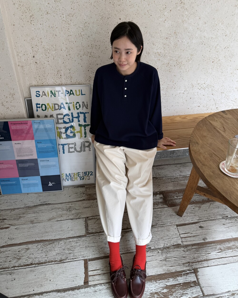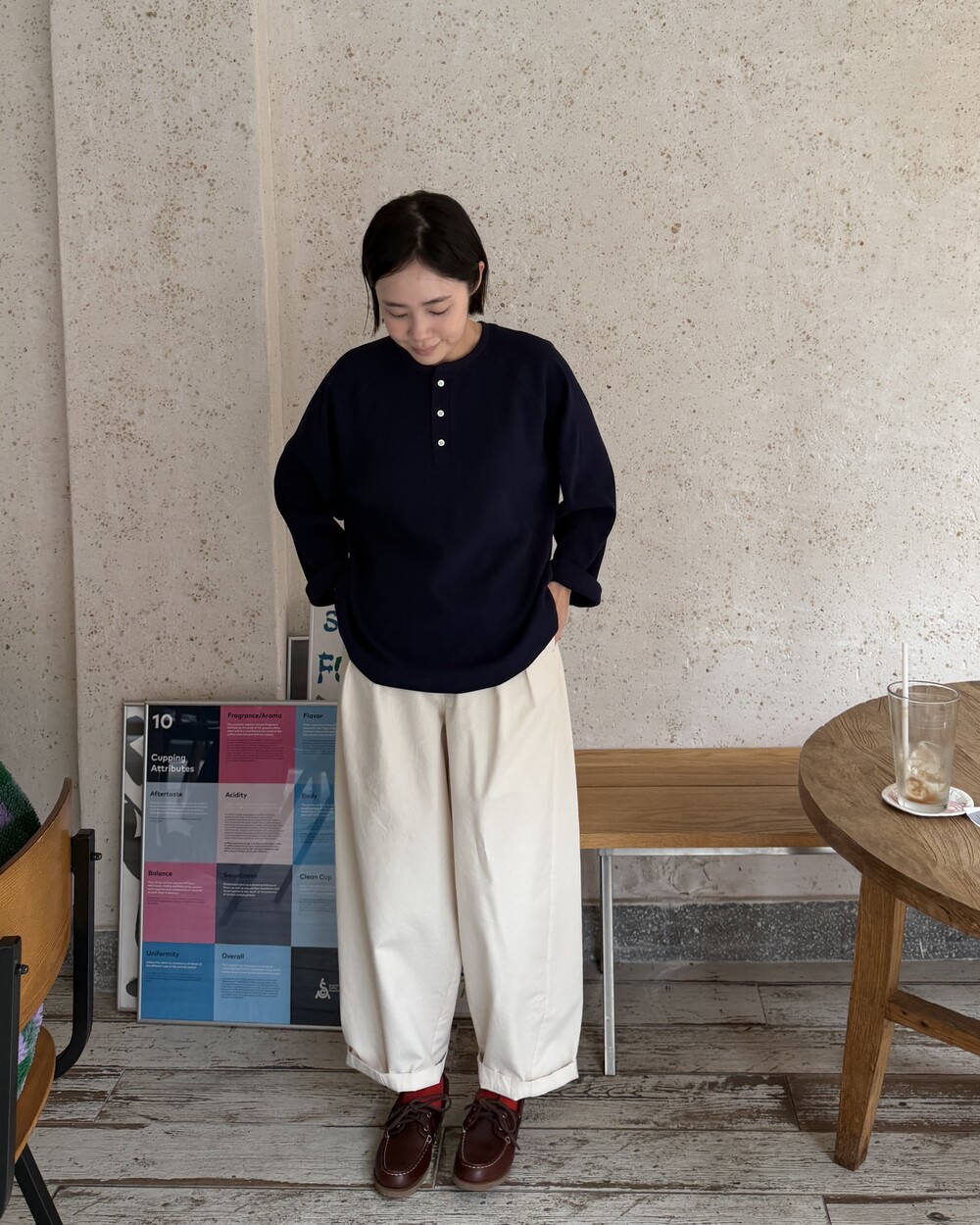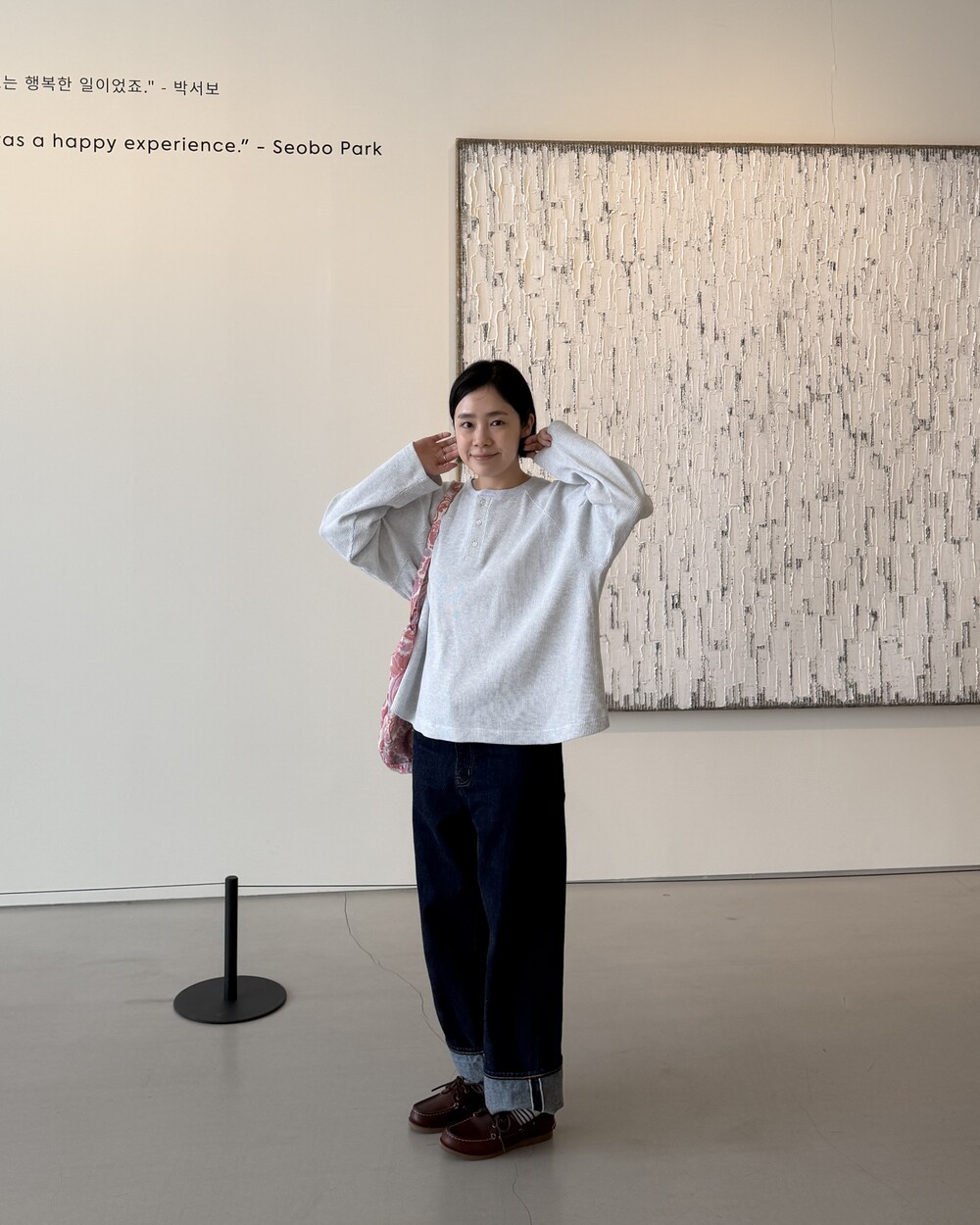헨리넥이라 편안한 티셔츠이지만 셔츠처럼 깔끔해 보이는 느낌도 들어요.