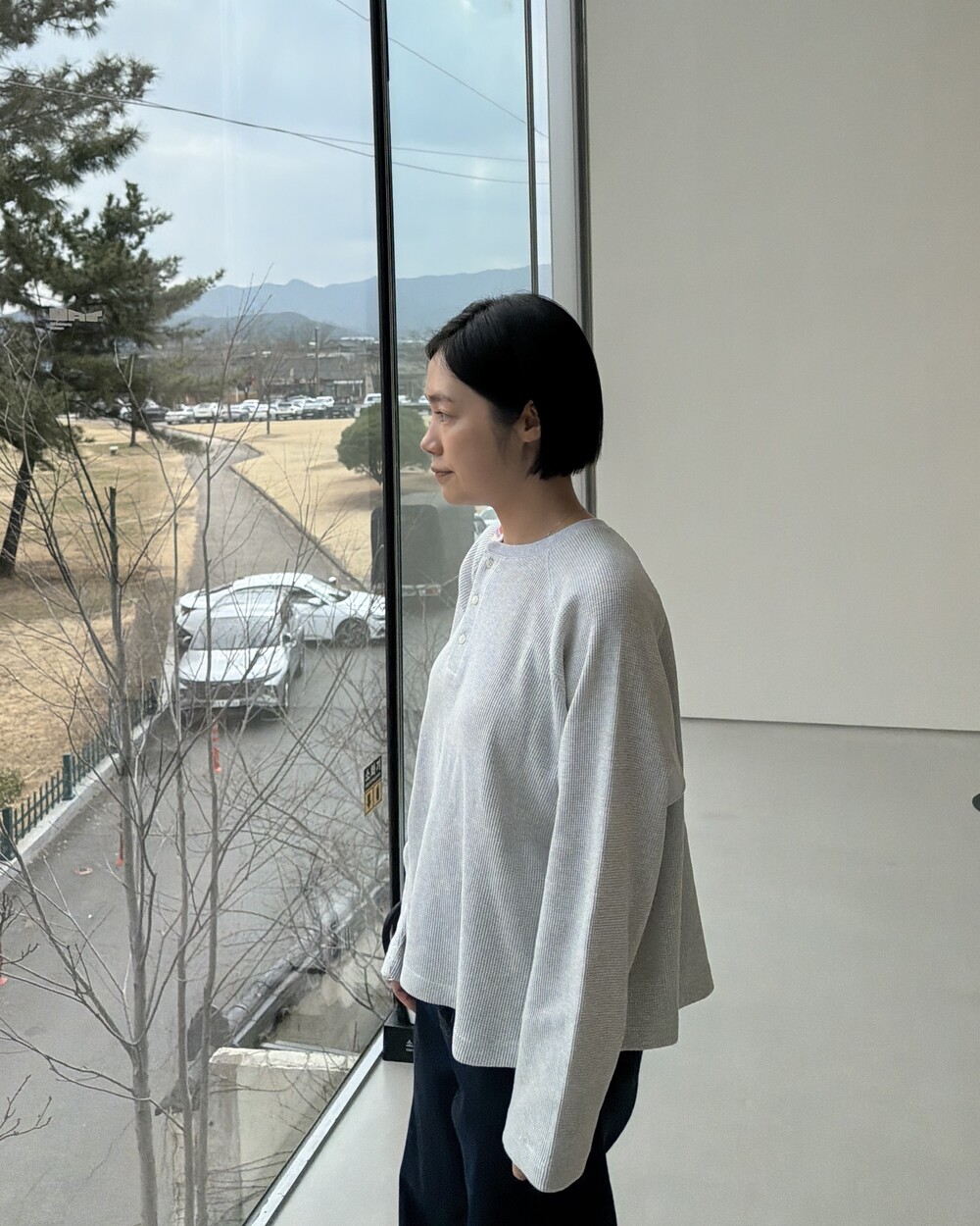 헨리넥 디자인이라 귀여운 자개단추까지 한 끗 다른 포인트가 되어주는 티셔츠예요-