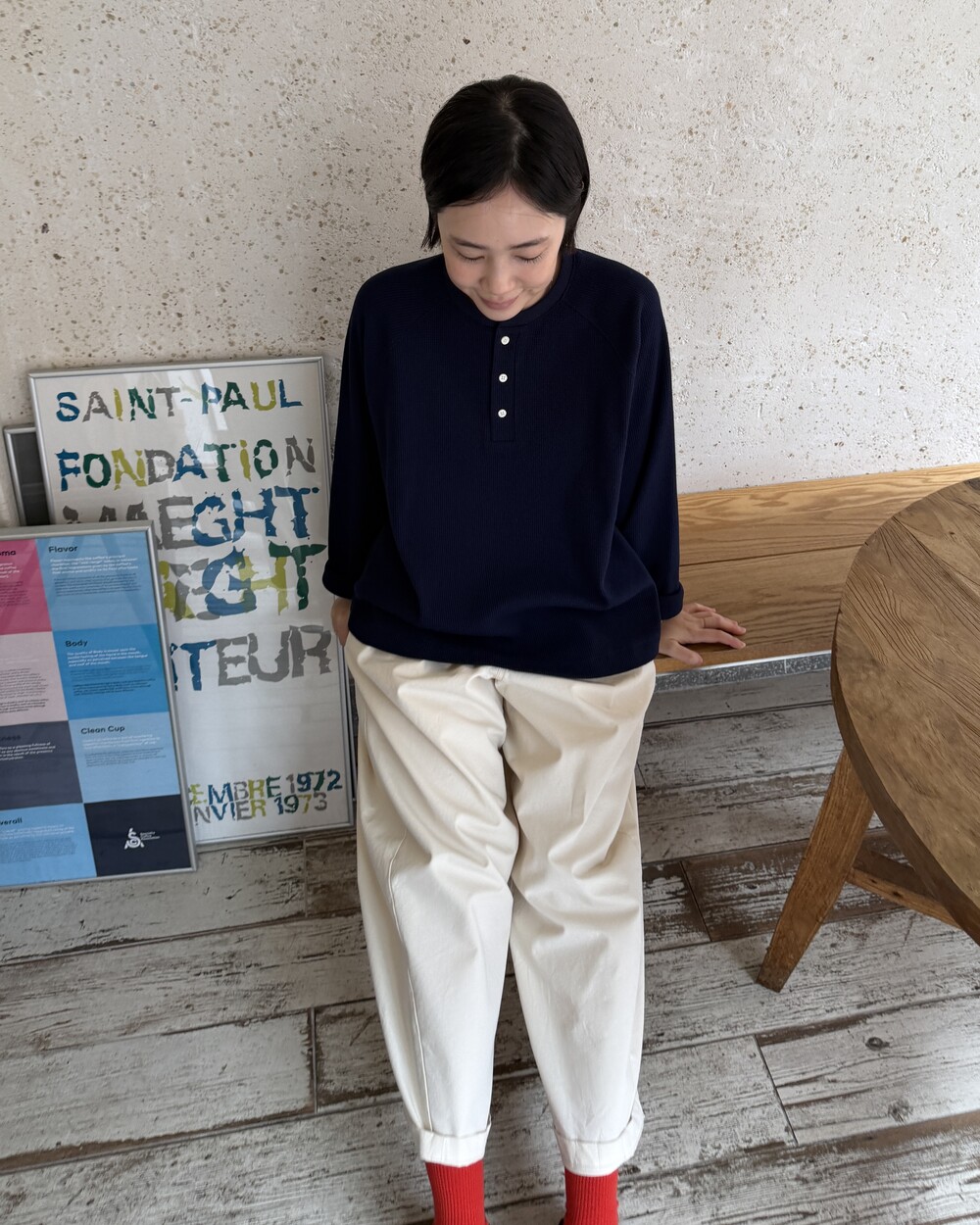 래글런 소매에 헨리넥 디자인으로 쪼르르 달린 자개단추가 단정하면서도 귀엽답니다.