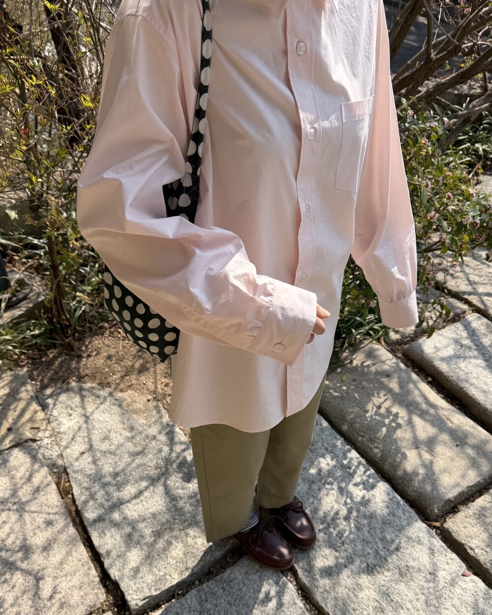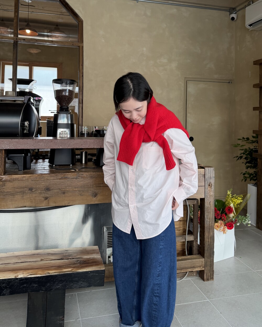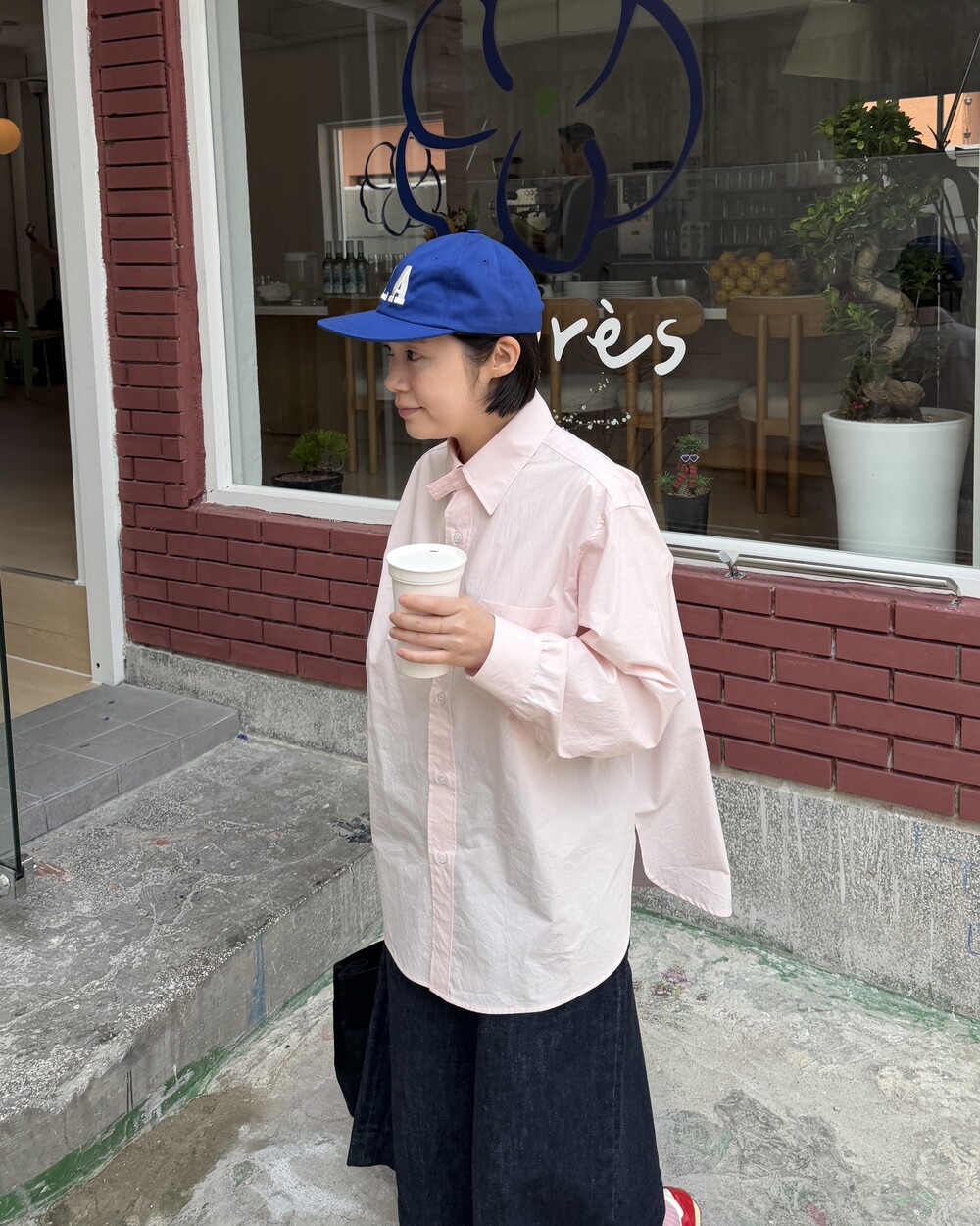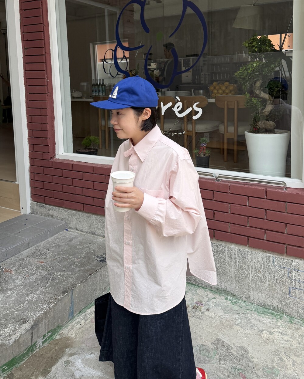 마치 남자친구나 아빠의 셔츠를 빌려 입은 듯한 무심한 듯한 무드이면서도 컬러감이나 옆라인 때문에 또 너무 매니시한 느낌은 아니어서 좋았어요!