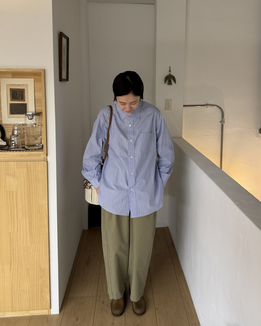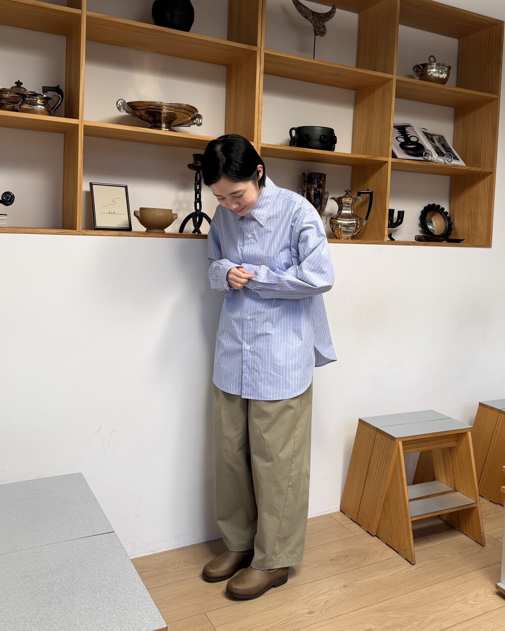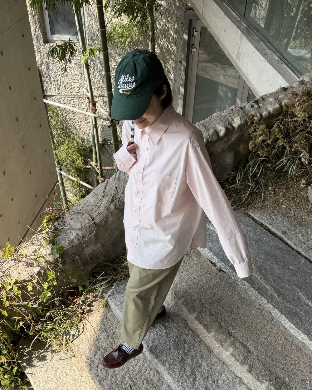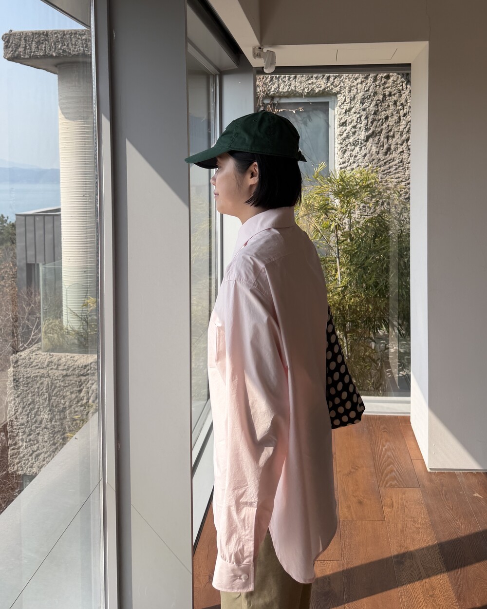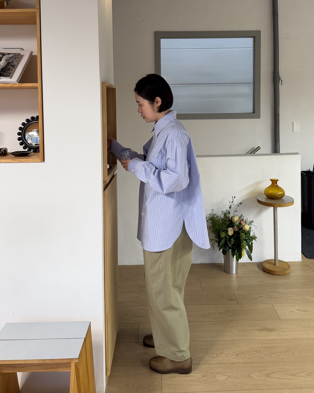 마치 남자친구나 아빠의 셔츠를 빌려 입은 듯한 무심한 듯한 무드이면서도 컬러감이나 옆라인 때문에 또 너무 매니시한 느낌은 아니어서 좋았어요!