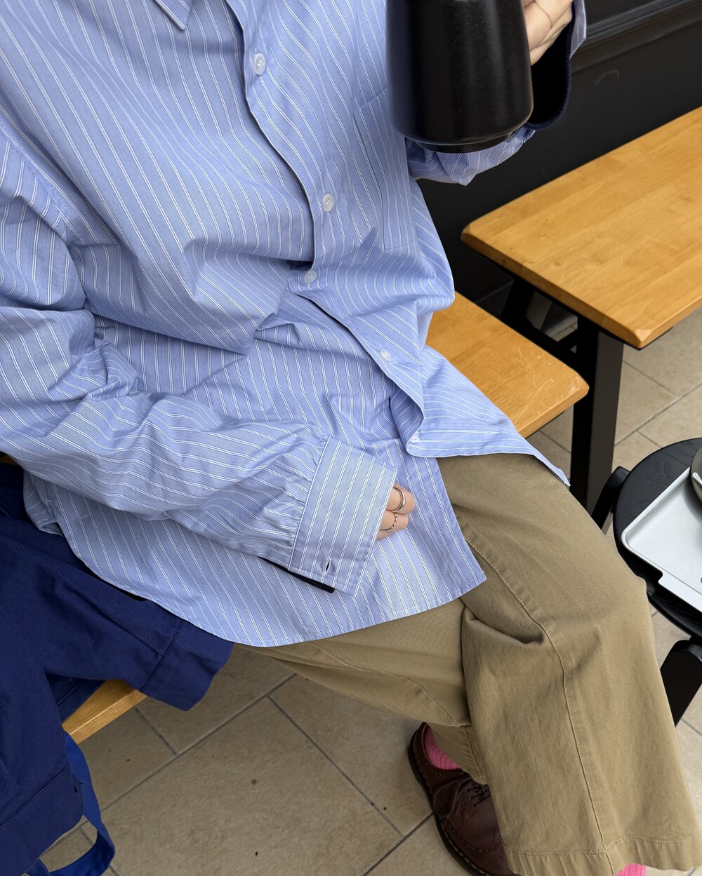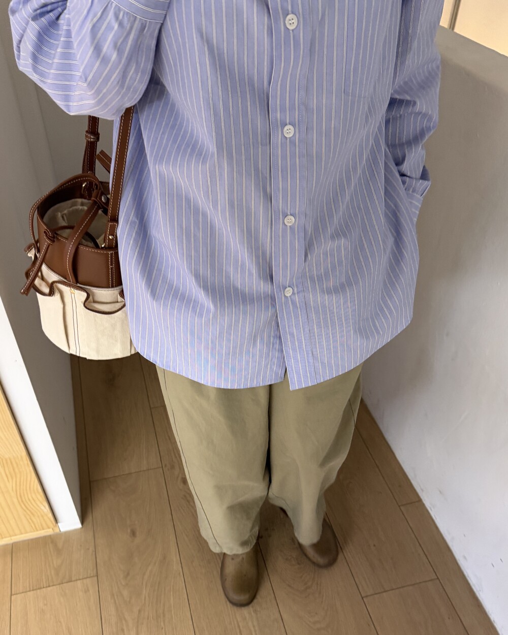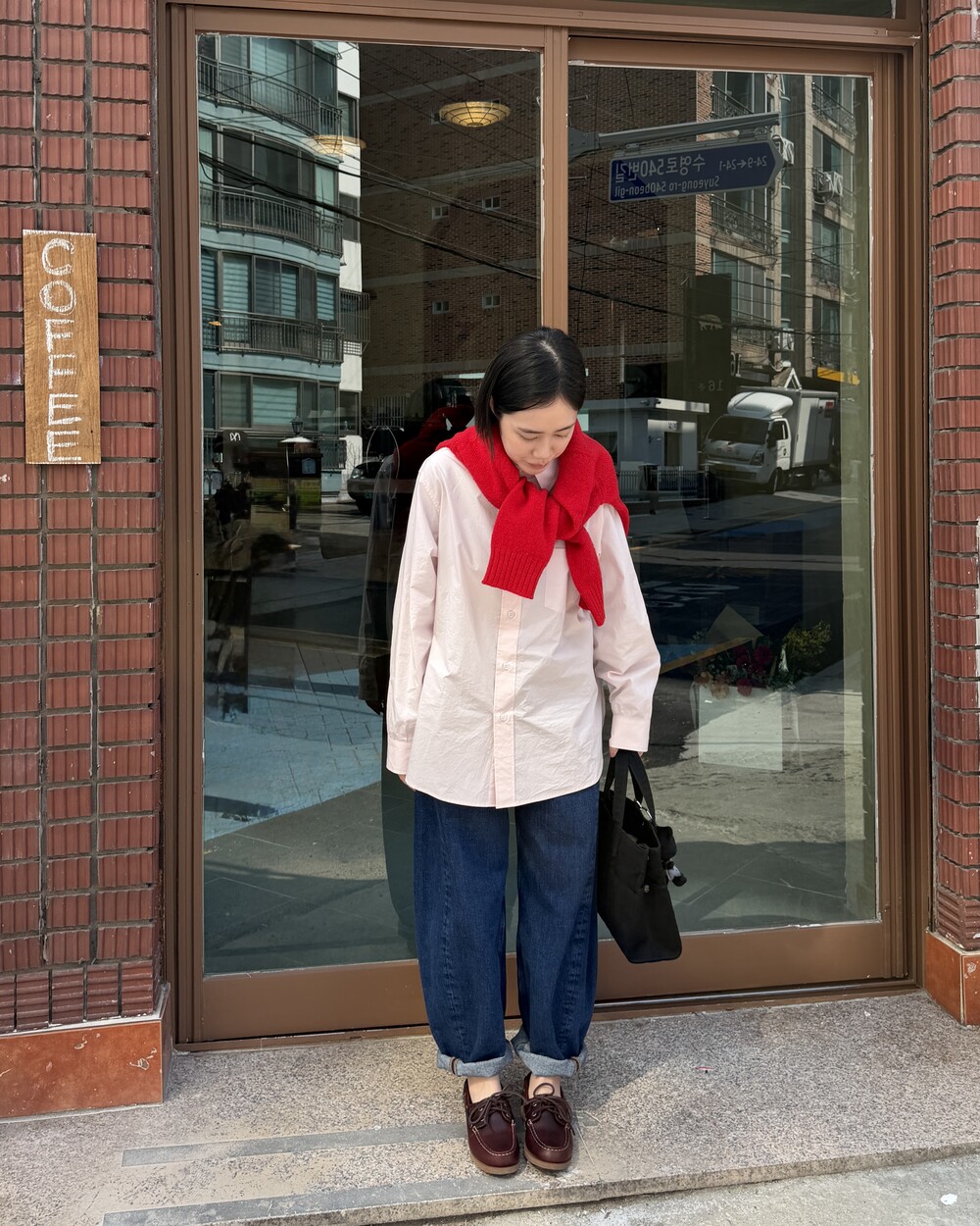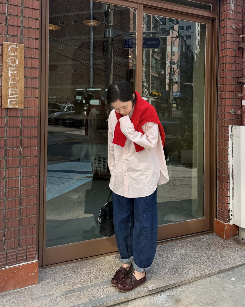 마치 남자친구나 아빠의 셔츠를 빌려 입은 듯한 무심한 듯한 무드이면서도 컬러감이나 옆라인 때문에 또 너무 매니시한 느낌은 아니어서 좋았어요!