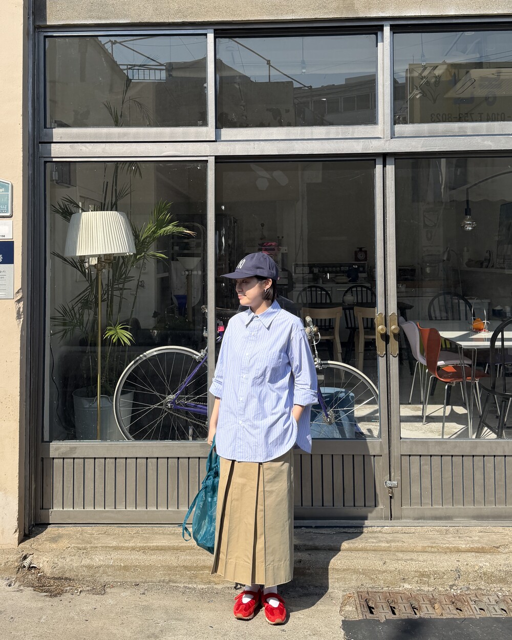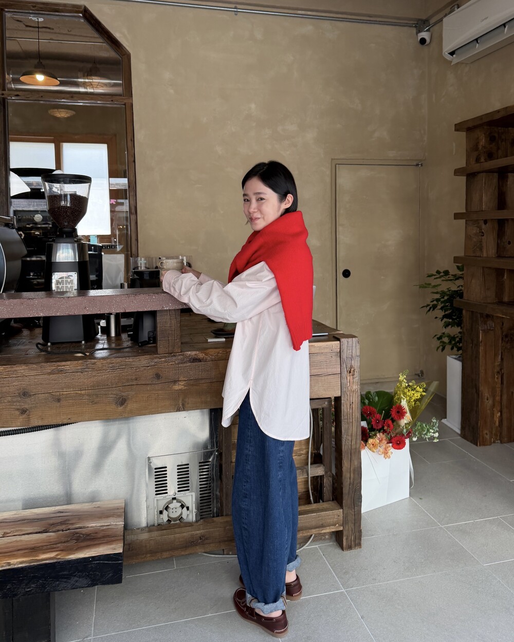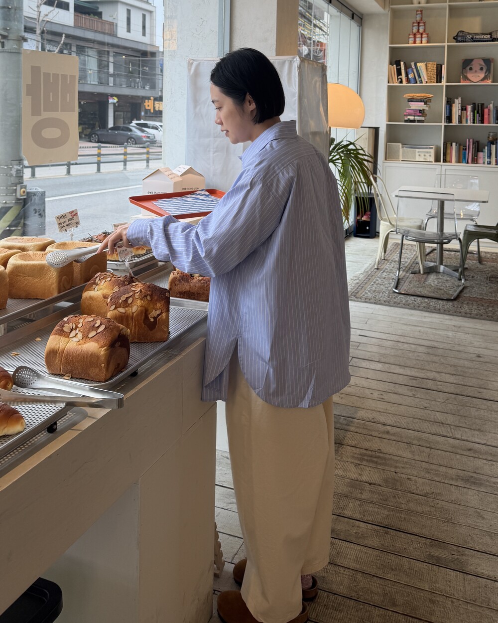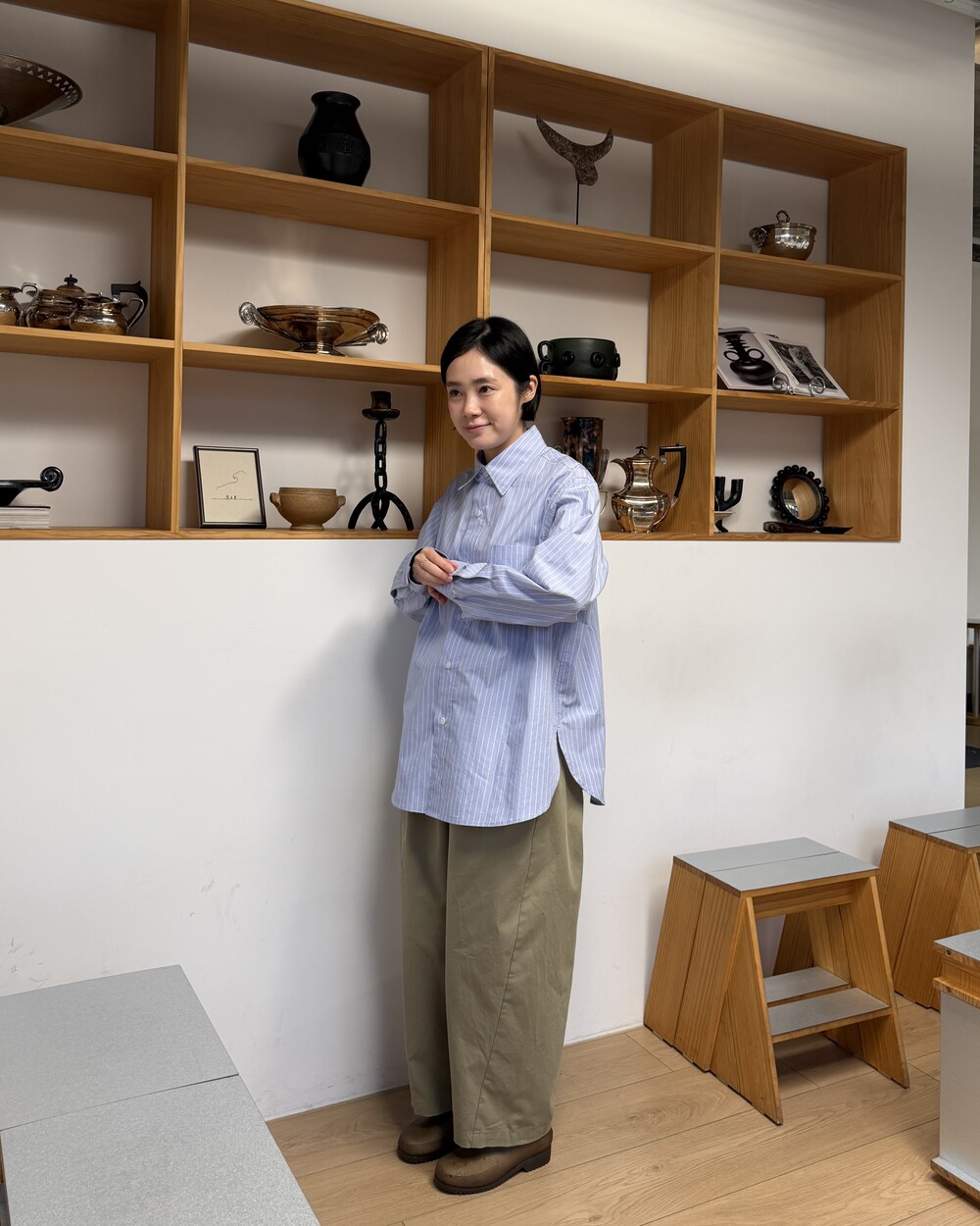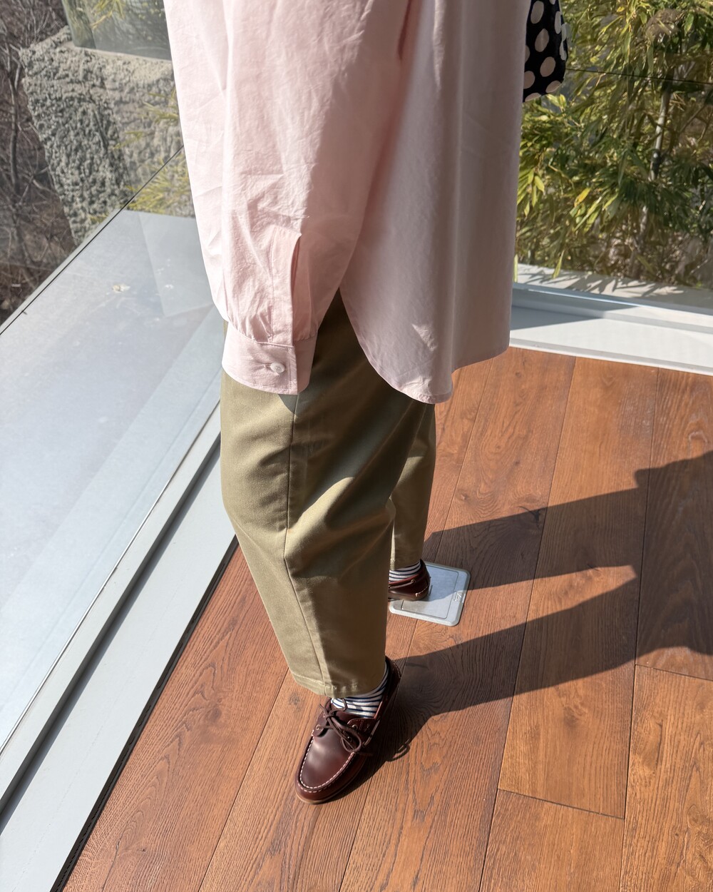 마치 남자친구나 아빠의 셔츠를 빌려 입은 듯한 무심한 듯한 무드이면서도 컬러감이나 옆라인 때문에 또 너무 매니시한 느낌은 아니어서 좋았어요!