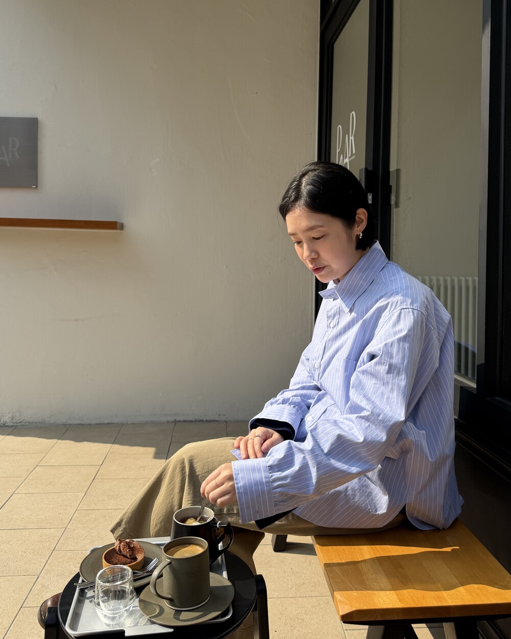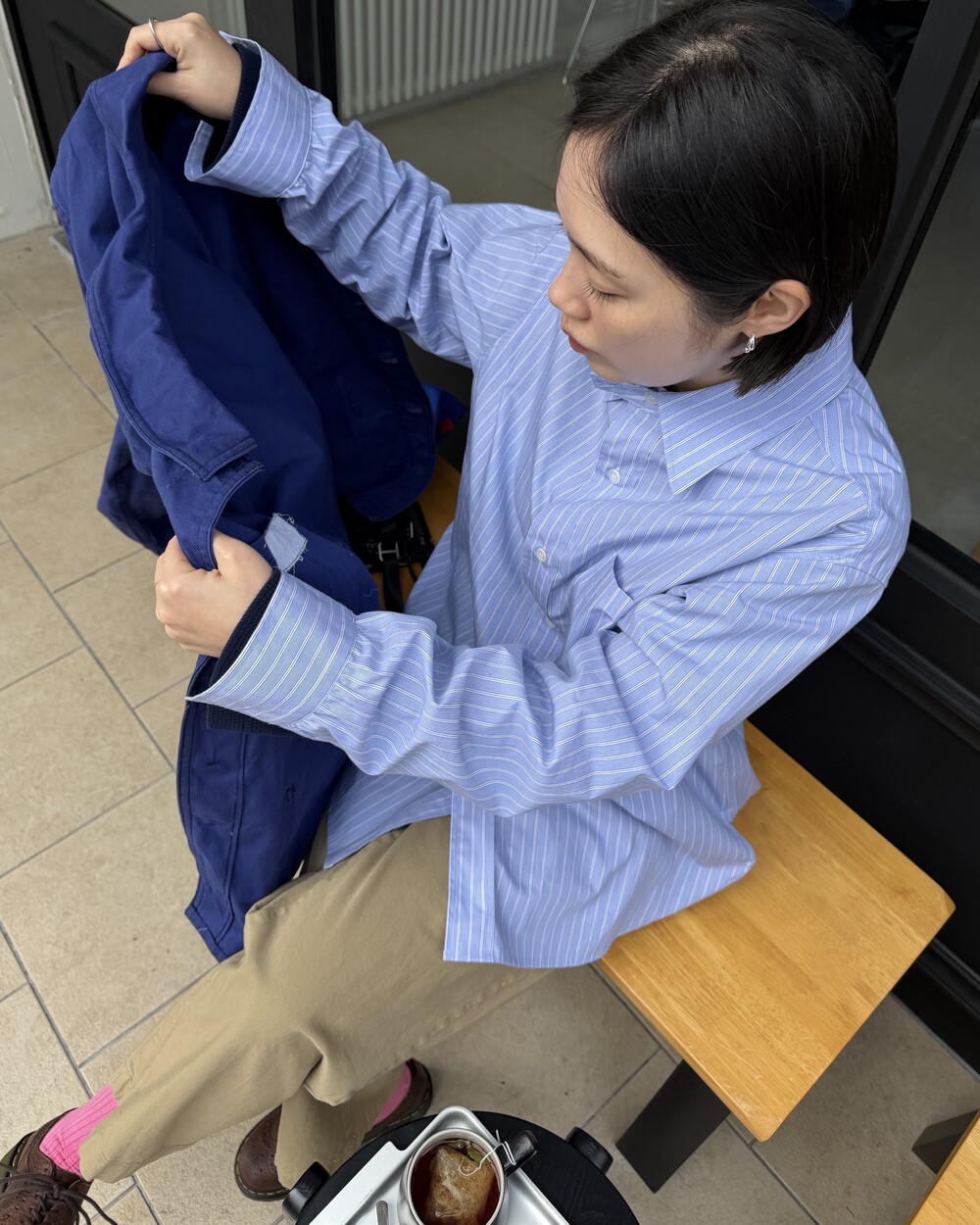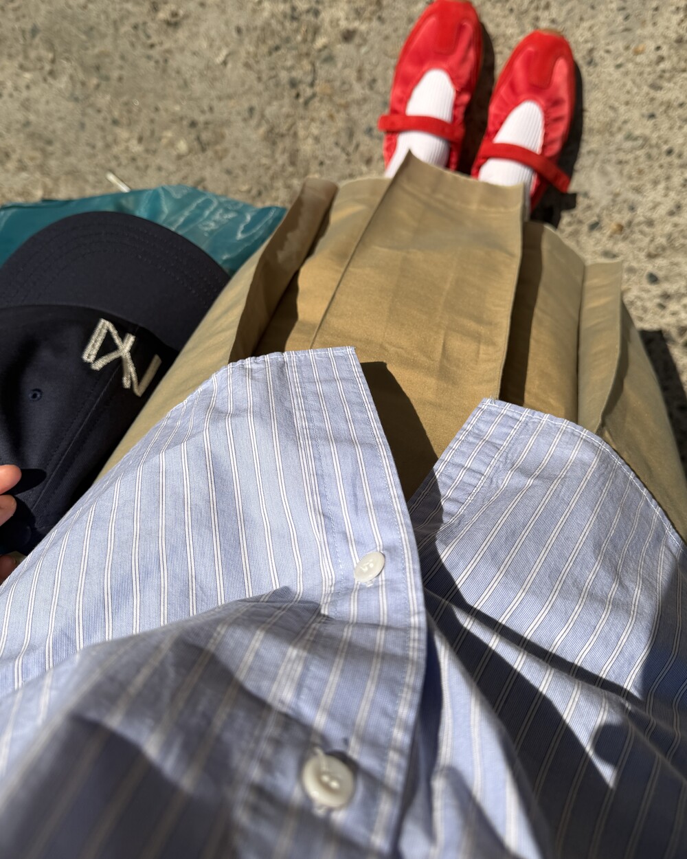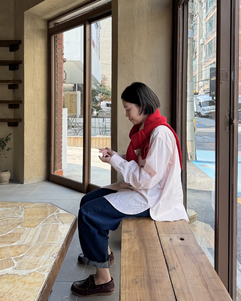 마치 남자친구나 아빠의 셔츠를 빌려 입은 듯한 무심한 듯한 무드이면서도 컬러감이나 옆라인 때문에 또 너무 매니시한 느낌은 아니어서 좋았어요!