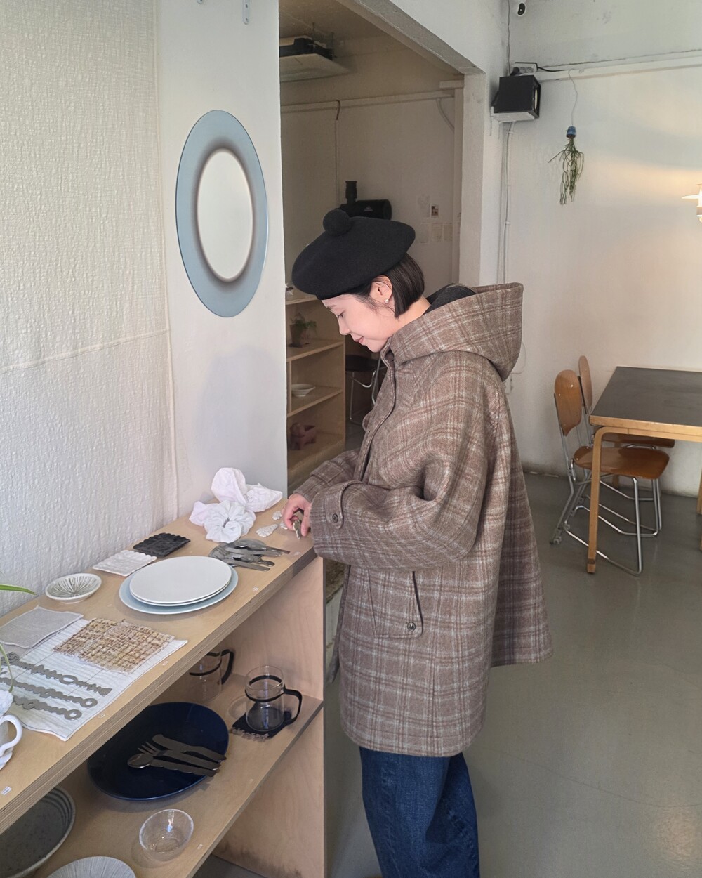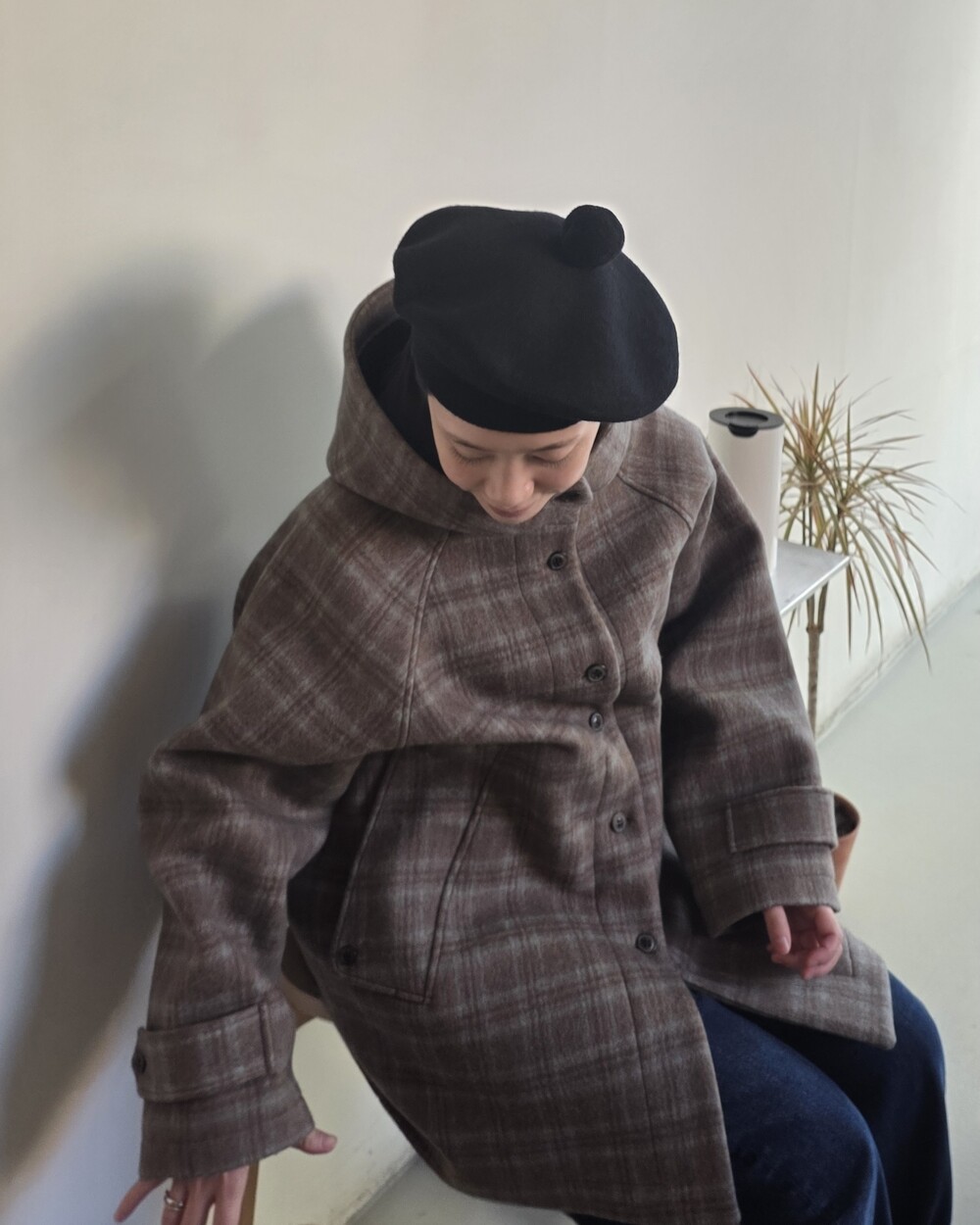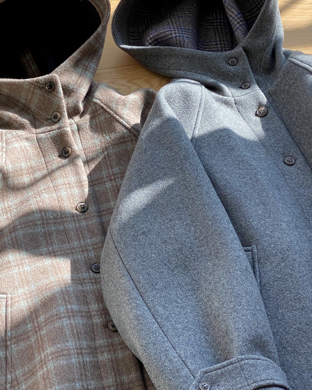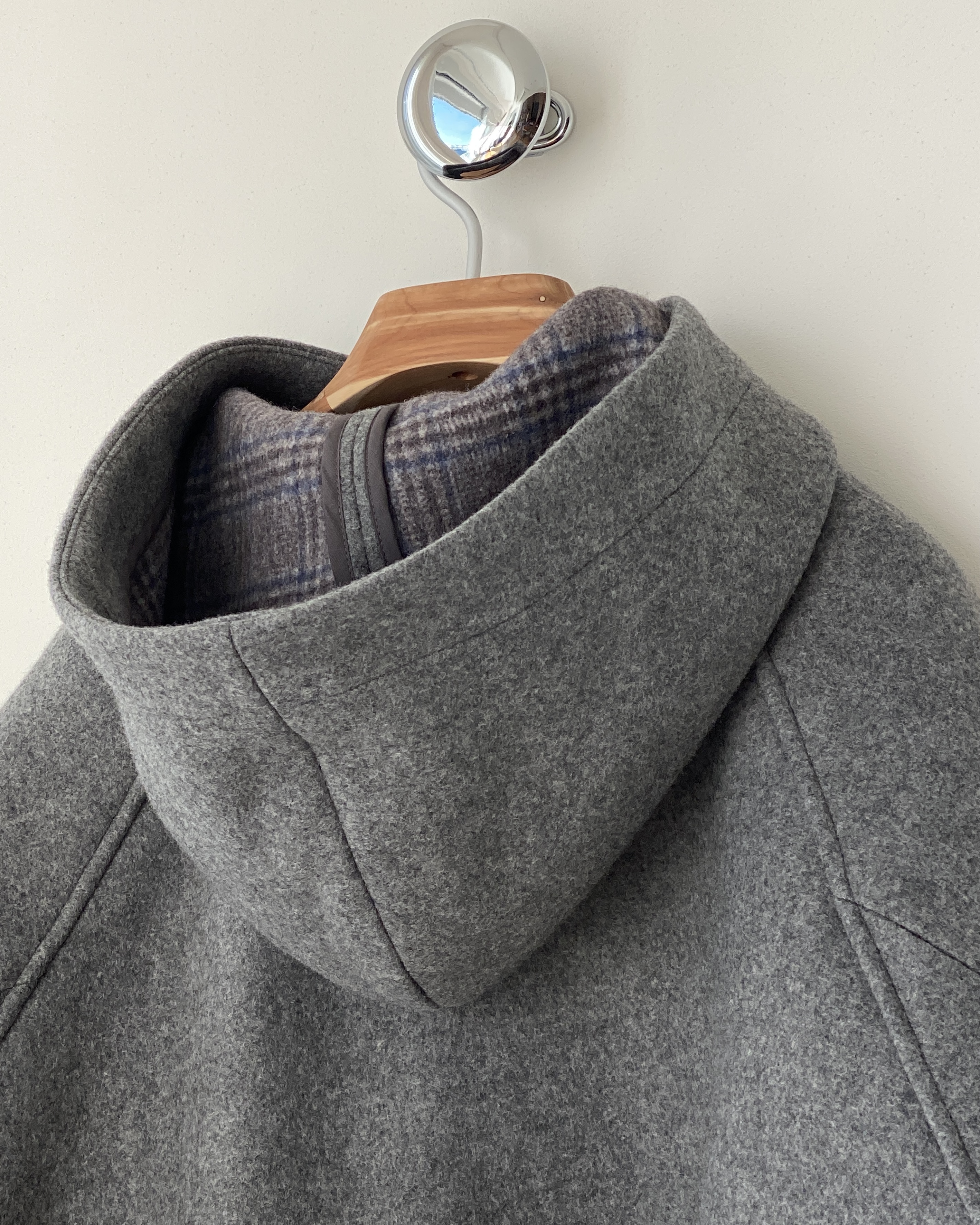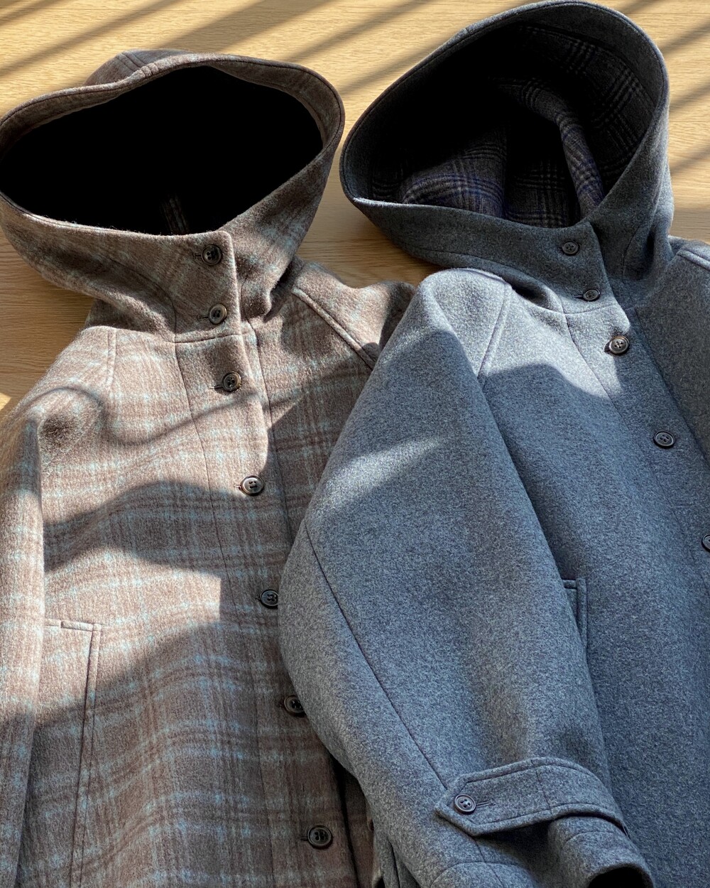 은은한 멜란지 그레이와 잔잔한 코코아/그린 체크가 돋보이는 두 가지 컬러의 후디드 코트 제작했어요.