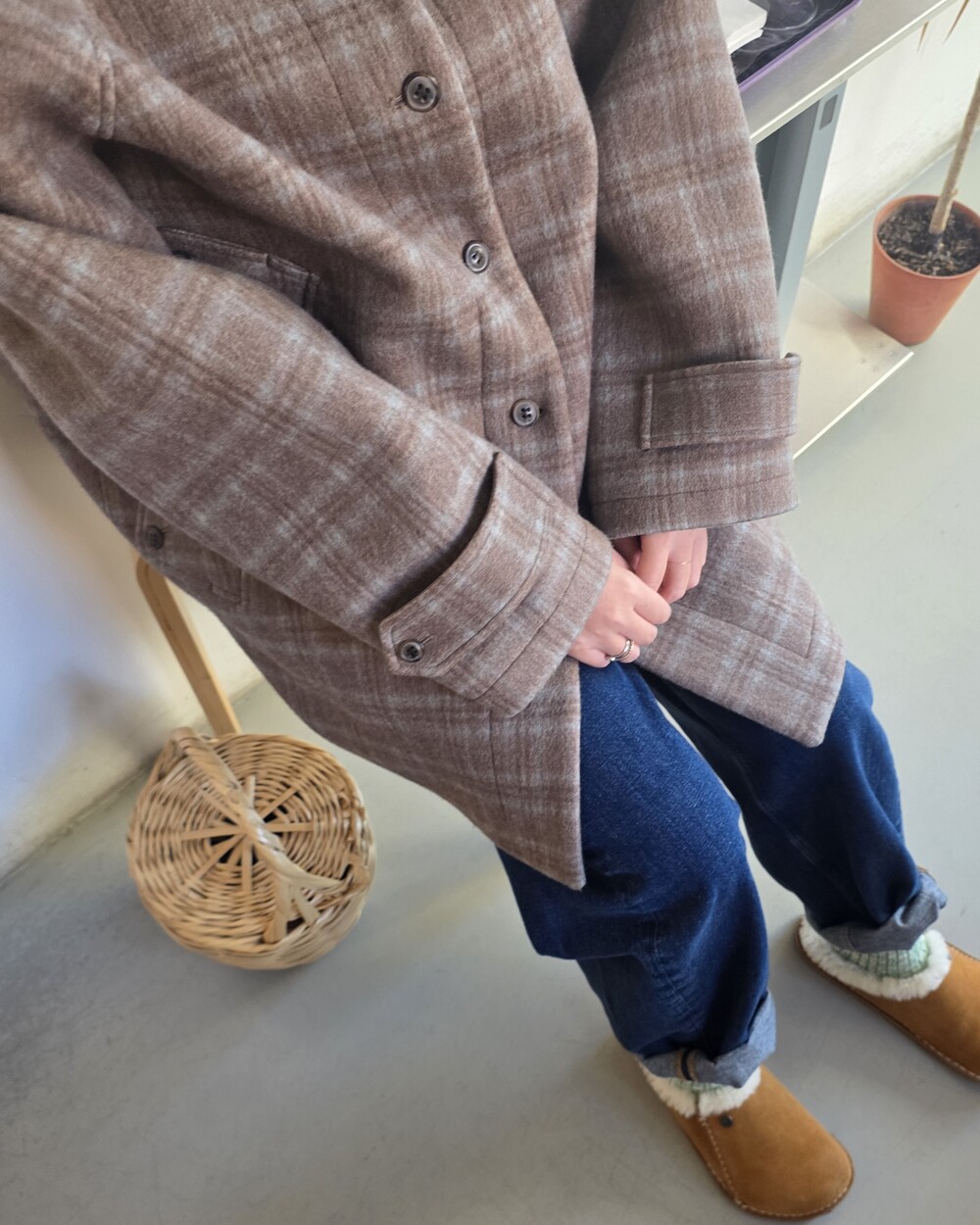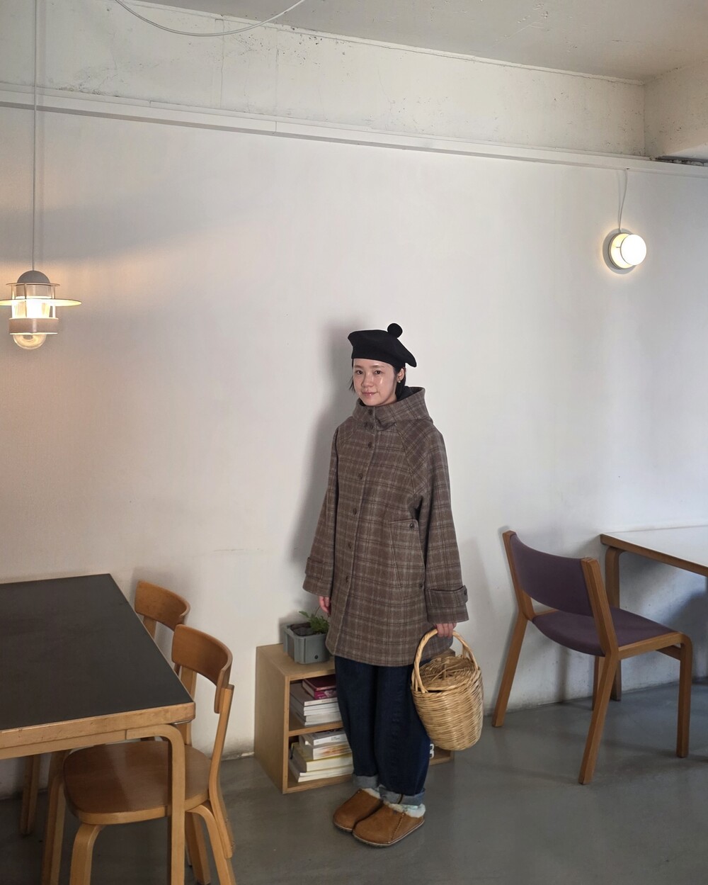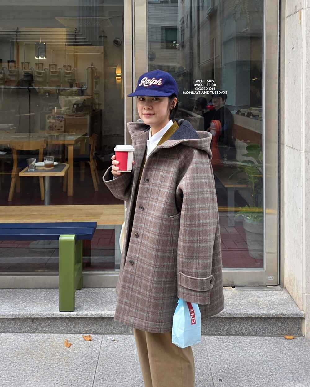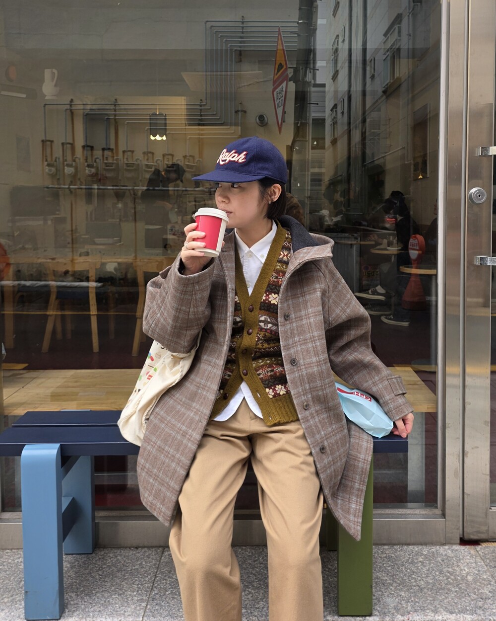 코코아 체크는 더 따뜻하고 빈티지한 느낌! 은은한 색감 조화에서 오는 특유의 분위기가 좋았어요. 니트나 코듀로이 팬츠, 버킷 백 등과 잘 매칭될 거예요.