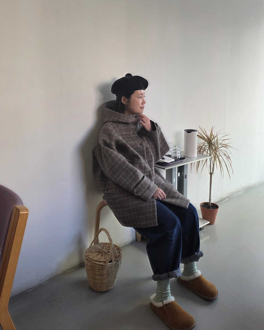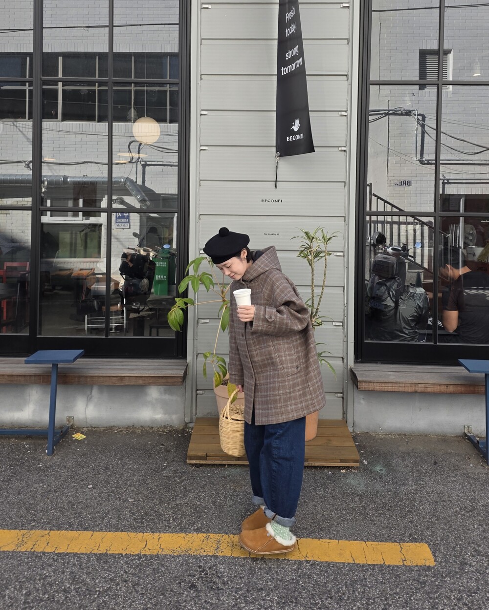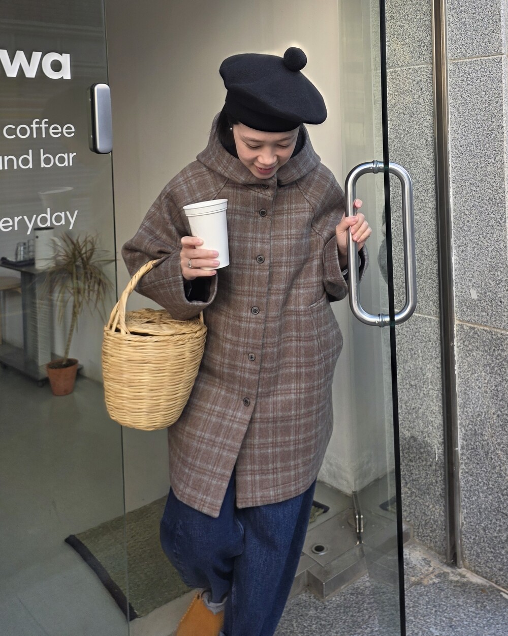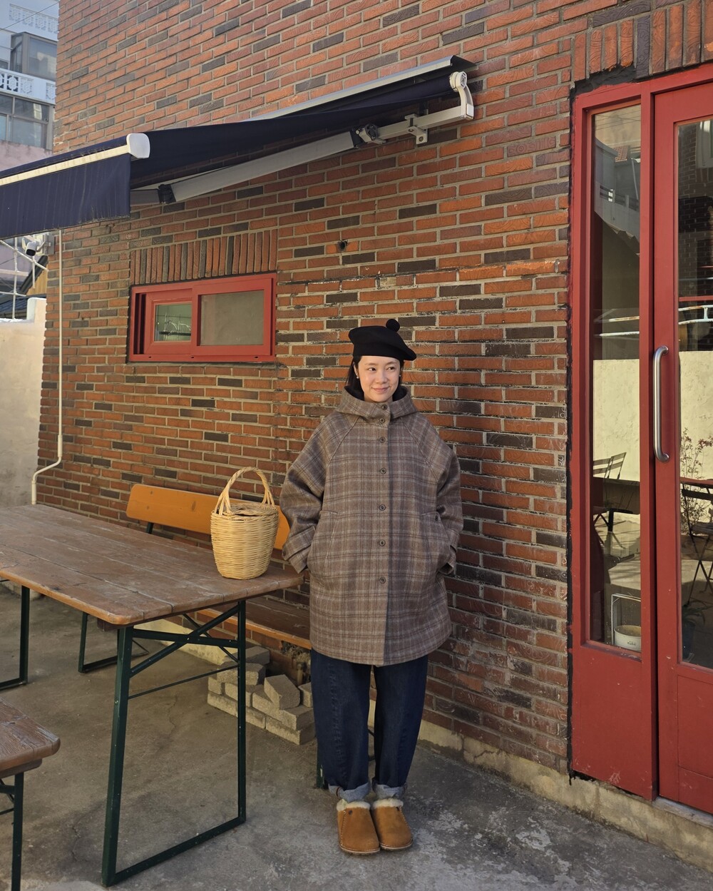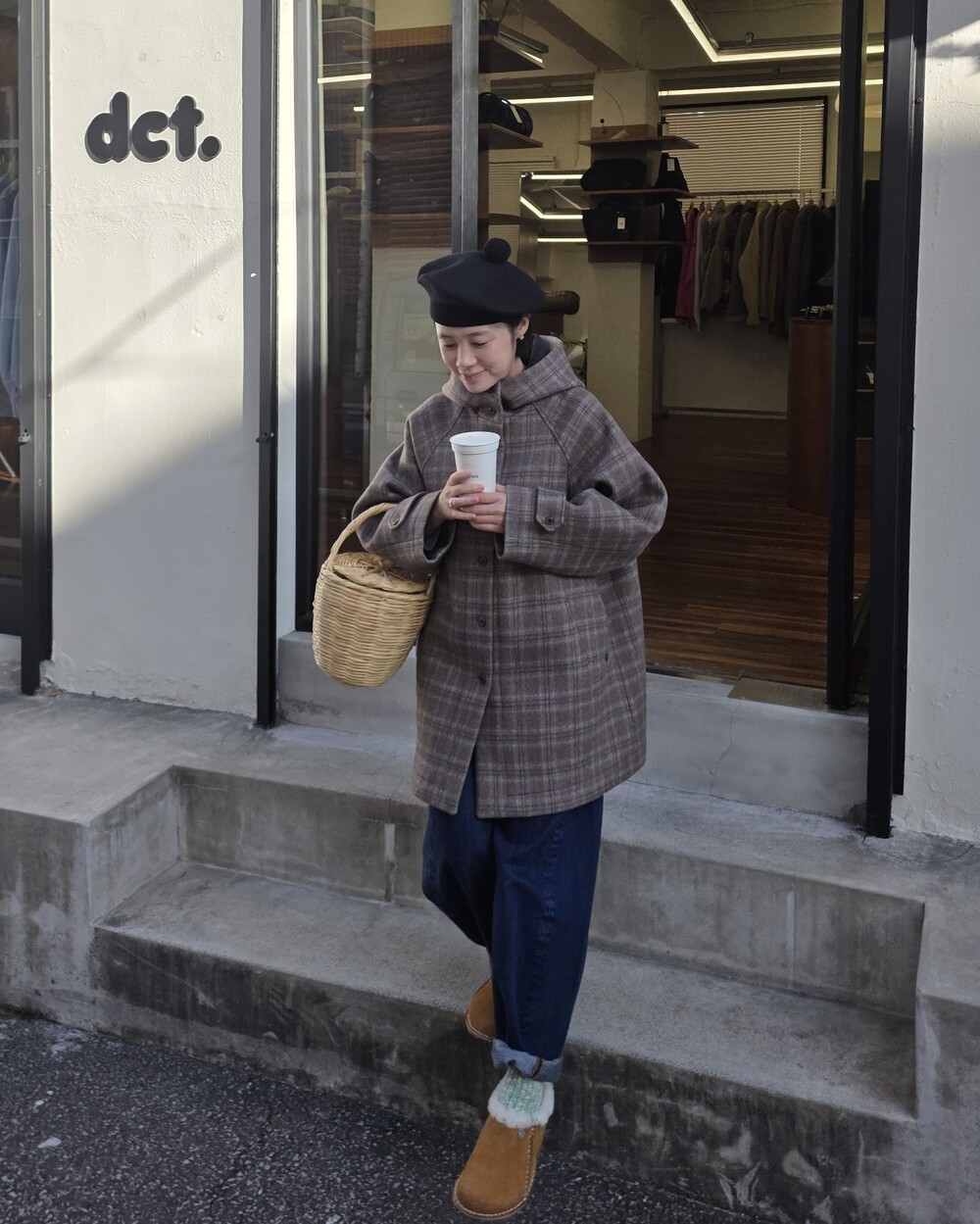 코코아 체크는 더 따뜻하고 빈티지한 느낌! 은은한 색감 조화에서 오는 특유의 분위기가 좋았어요. 니트나 코듀로이 팬츠, 버킷 백 등과 잘 매칭될 거예요.