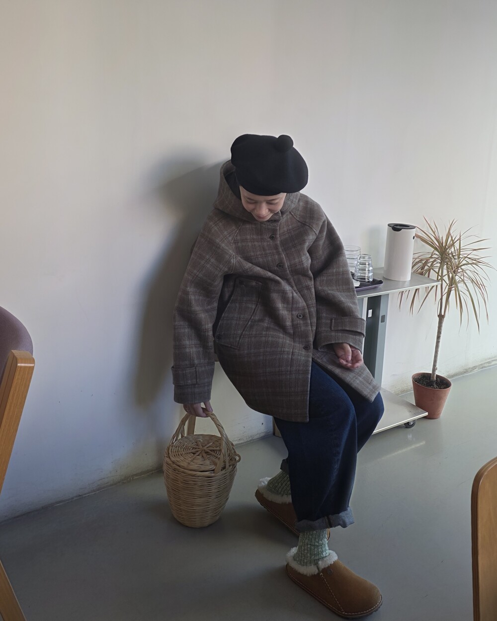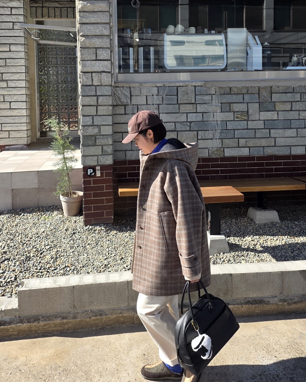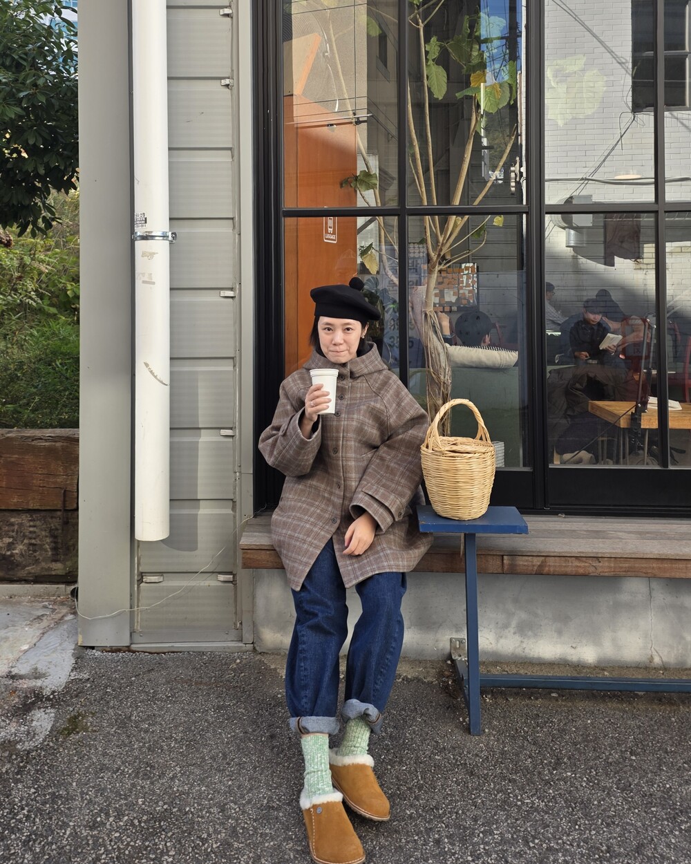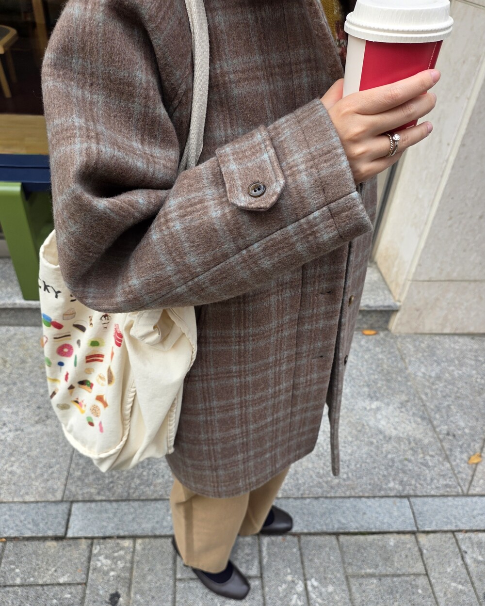 코코아 체크는 더 따뜻하고 빈티지한 느낌! 은은한 색감 조화에서 오는 특유의 분위기가 좋았어요. 니트나 코듀로이 팬츠, 버킷 백 등과 잘 매칭될 거예요.