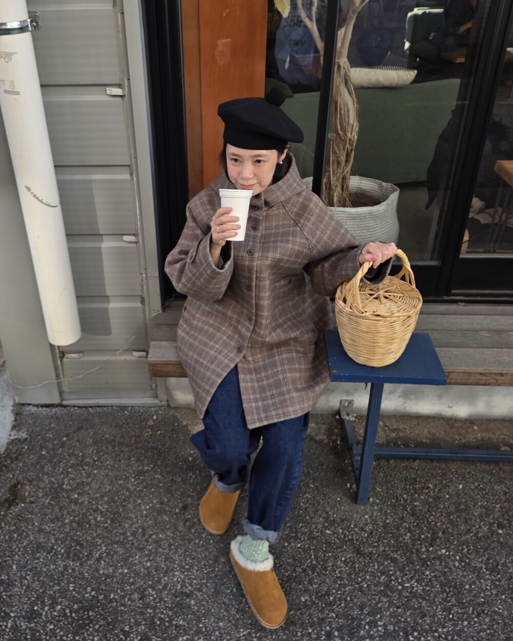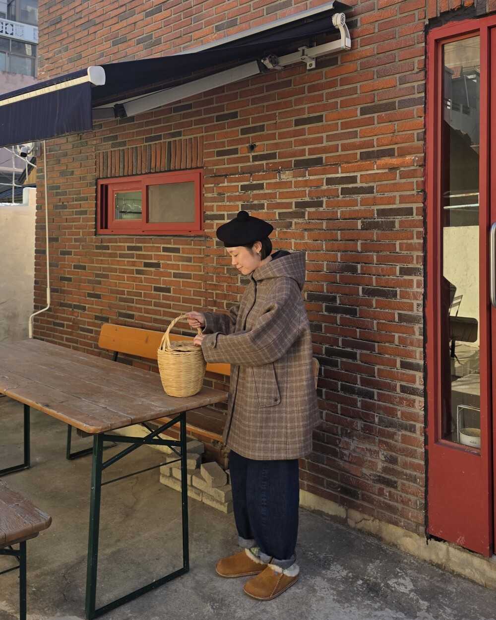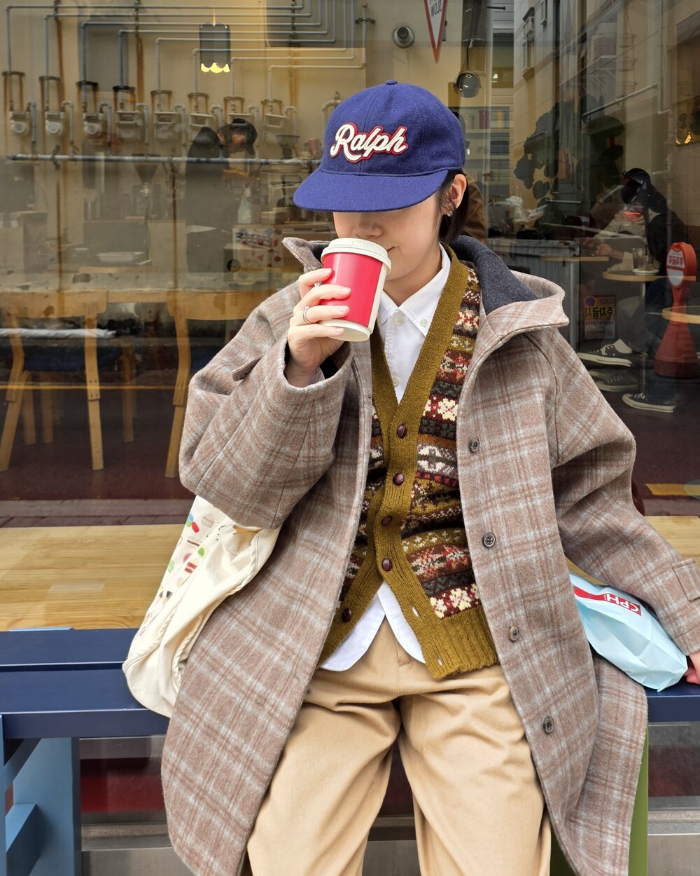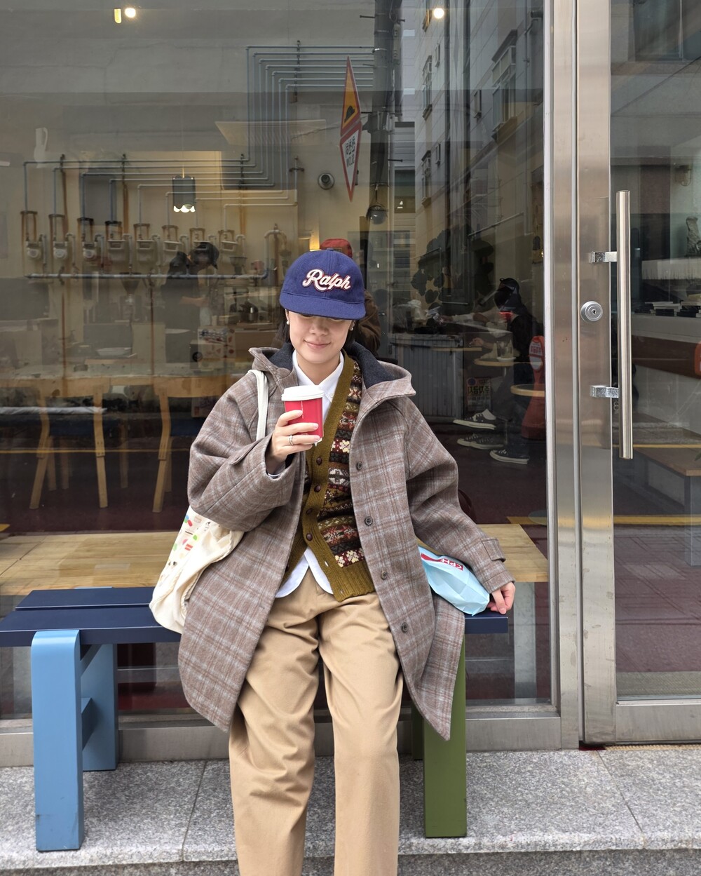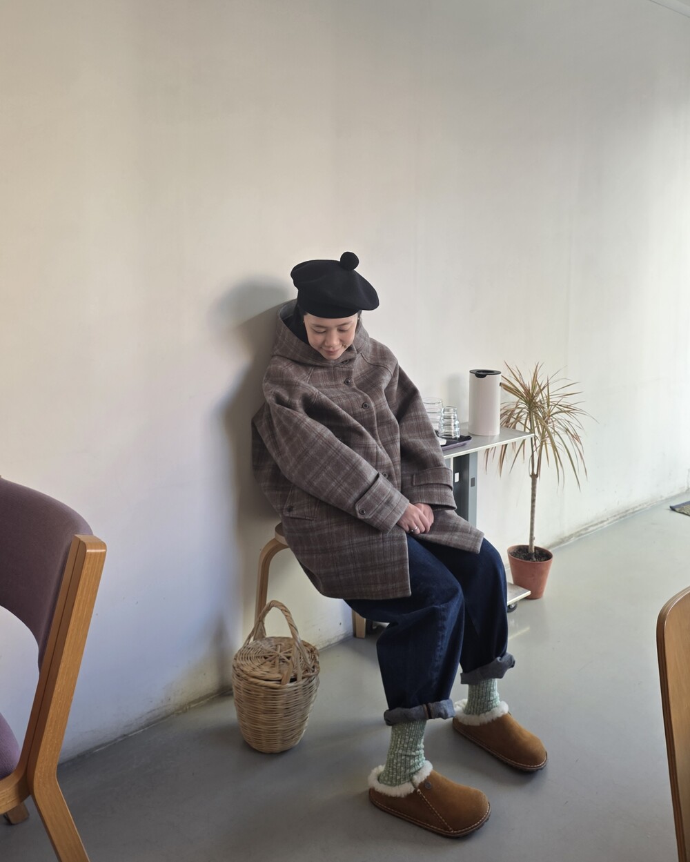 코코아 체크는 더 따뜻하고 빈티지한 느낌! 은은한 색감 조화에서 오는 특유의 분위기가 좋았어요. 니트나 코듀로이 팬츠, 버킷 백 등과 잘 매칭될 거예요.