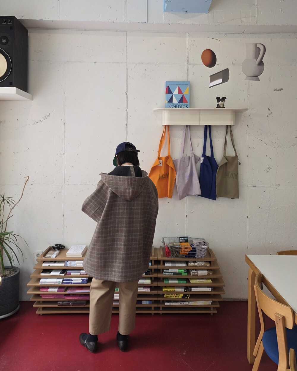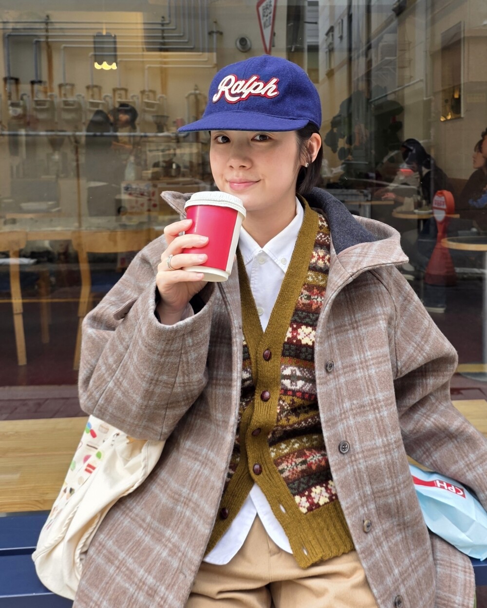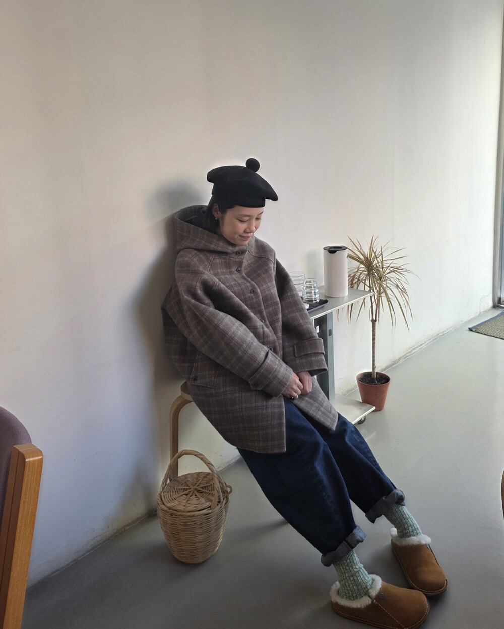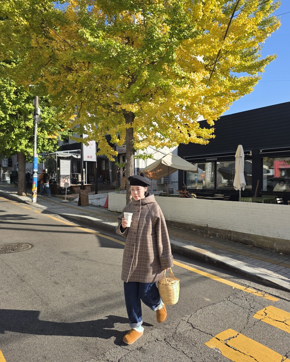 코코아 체크는 더 따뜻하고 빈티지한 느낌! 은은한 색감 조화에서 오는 특유의 분위기가 좋았어요. 니트나 코듀로이 팬츠, 버킷 백 등과 잘 매칭될 거예요.