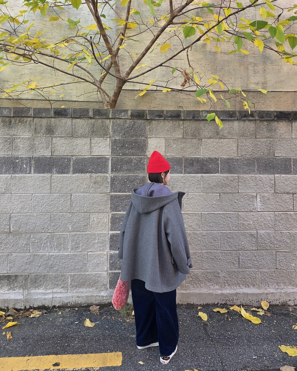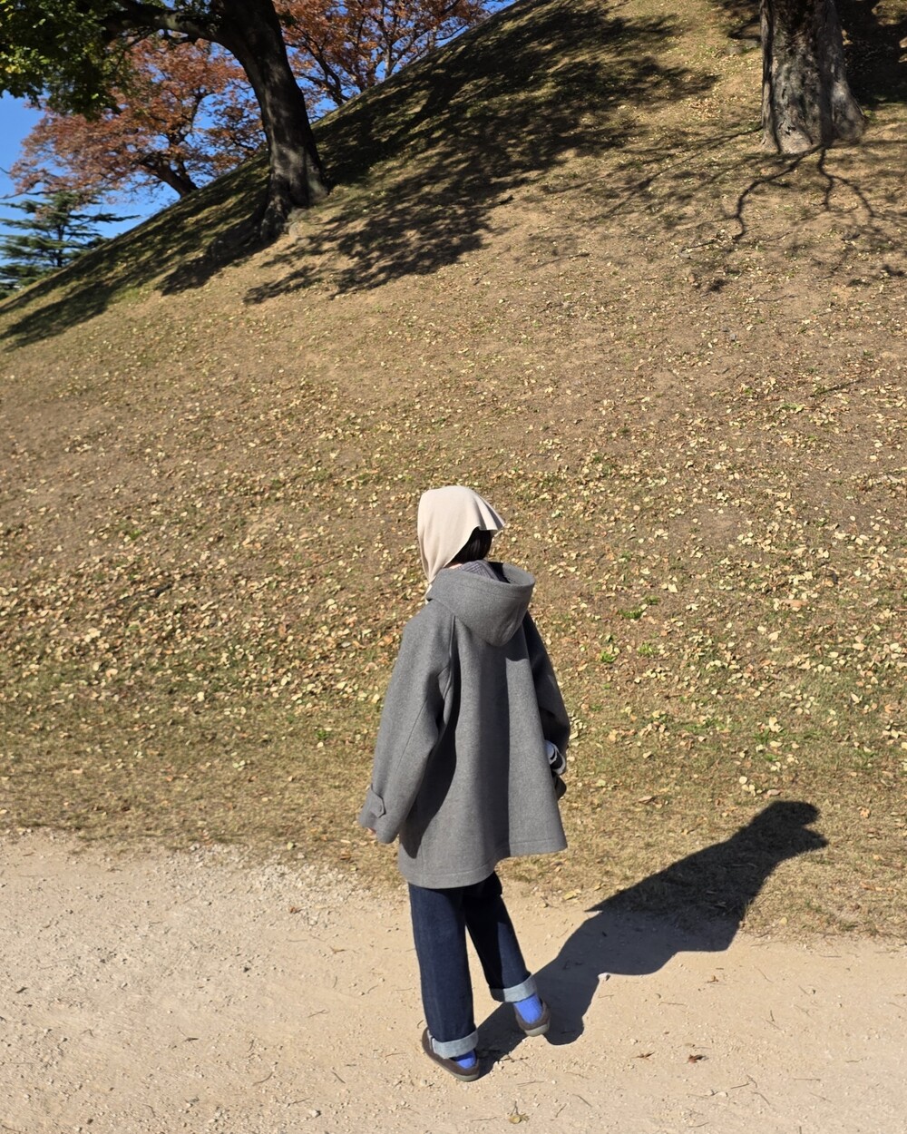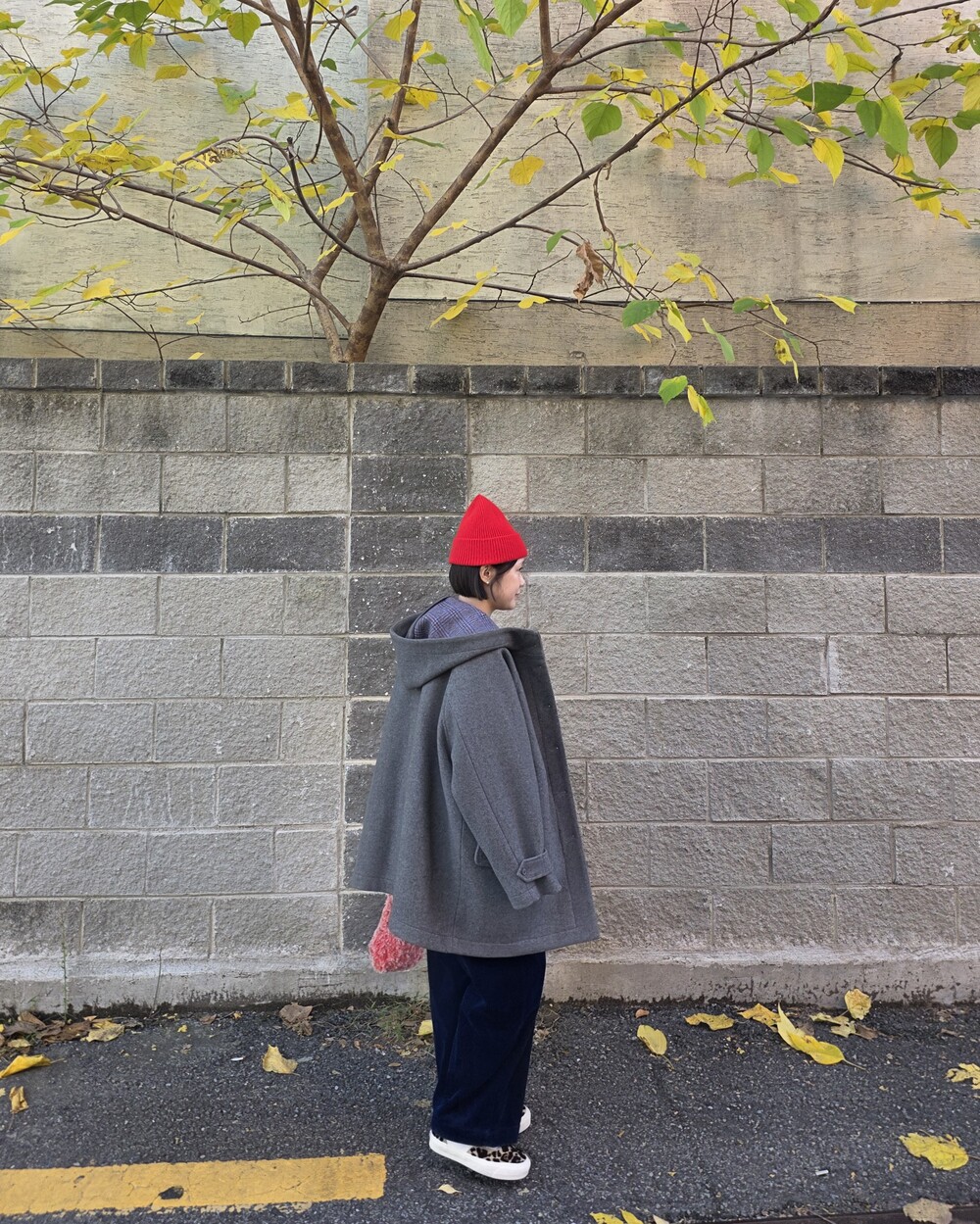 목을 자연스럽게 감싸주는 후드 라인 덕분에 머플러 없이도 따뜻하고 완성도 있는 실루엣입니다. 물론 안쪽으로 따뜻하게 머플러를 해주어도 너무 좋고요!
