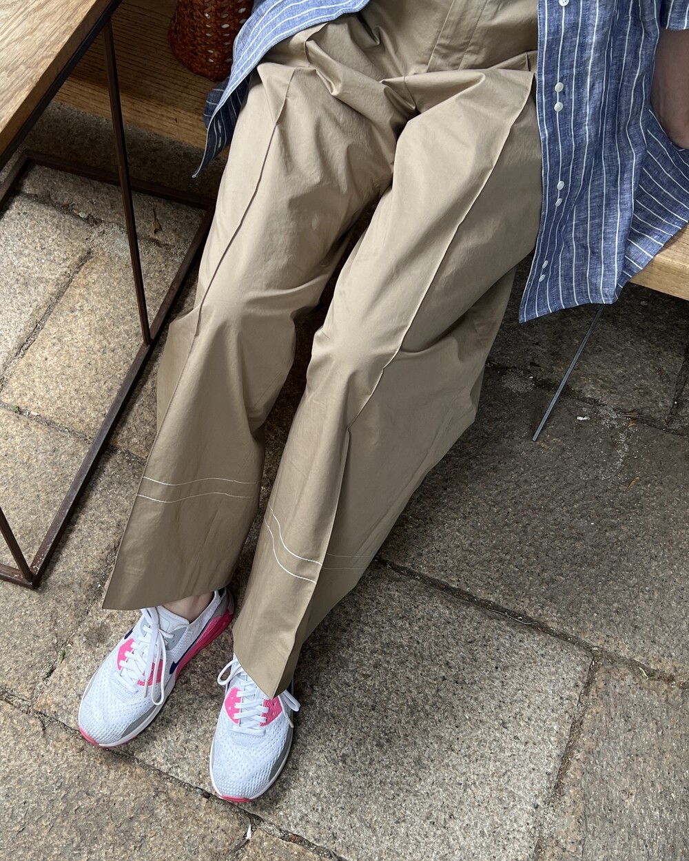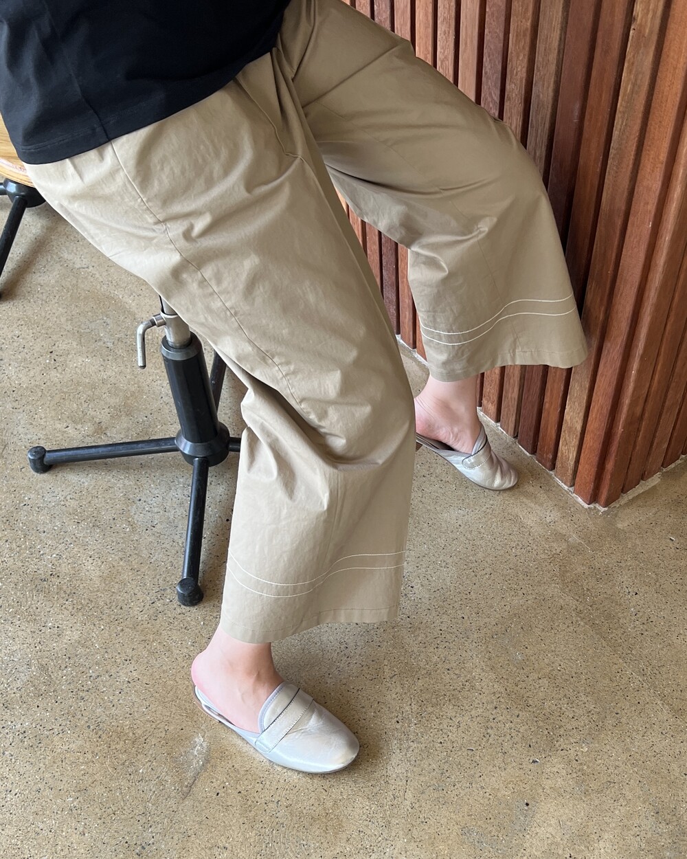 초가을까지 쭉 입기 좋은 페이퍼처럼 바스락거리는 느낌이 좋은 와이드 핏의 코튼 팬츠 보여드려요.