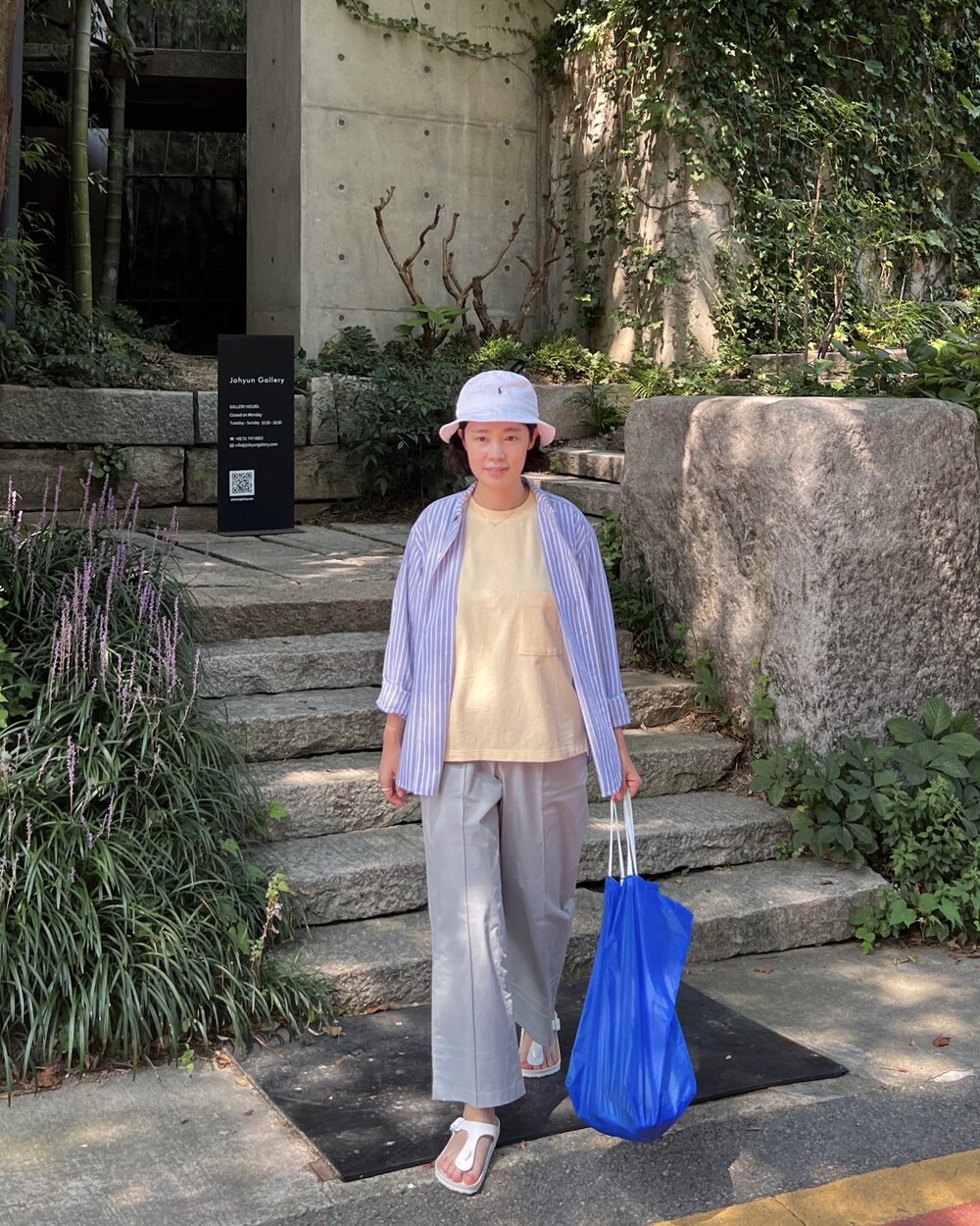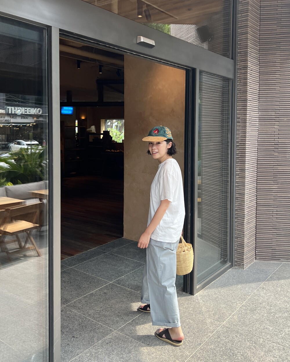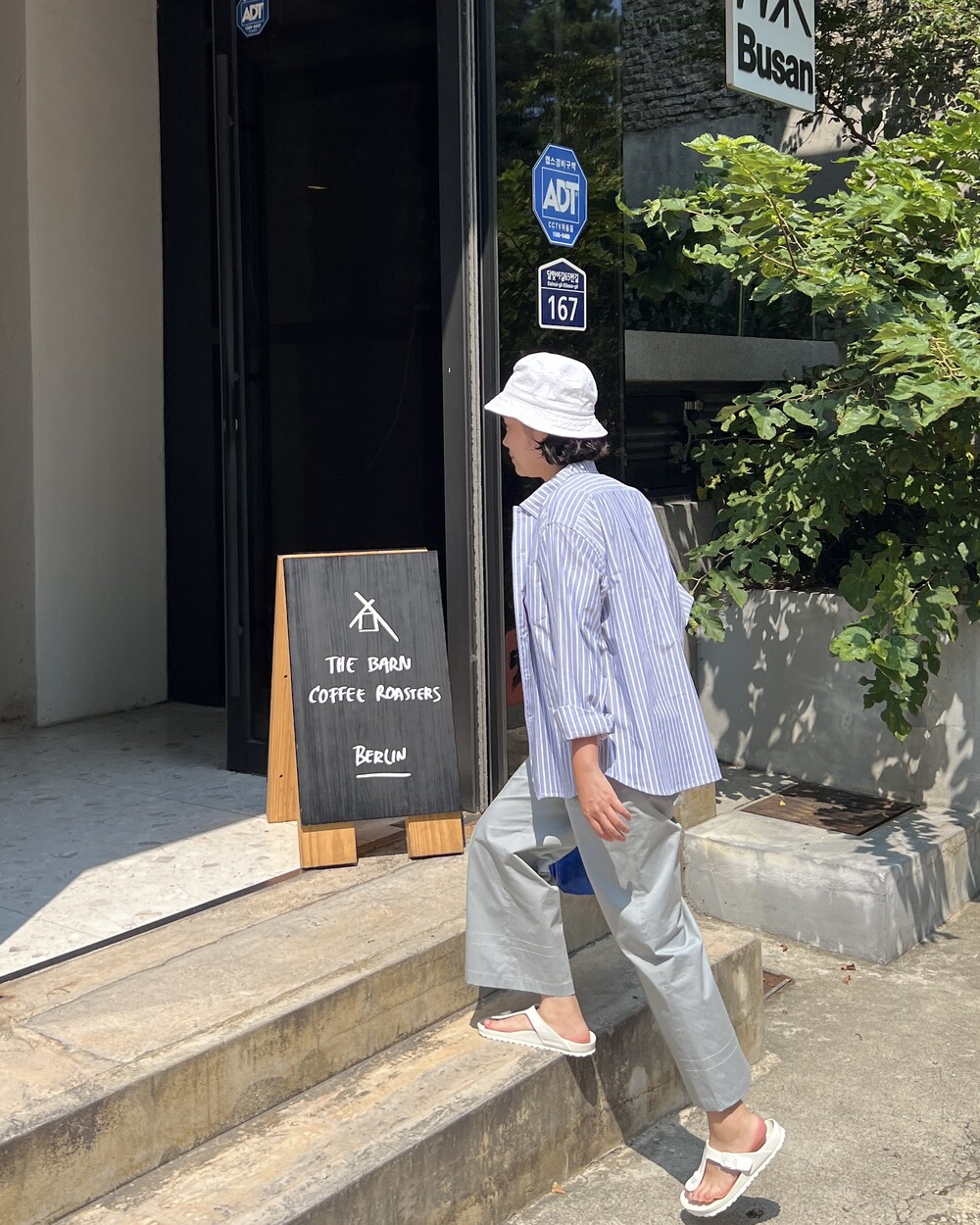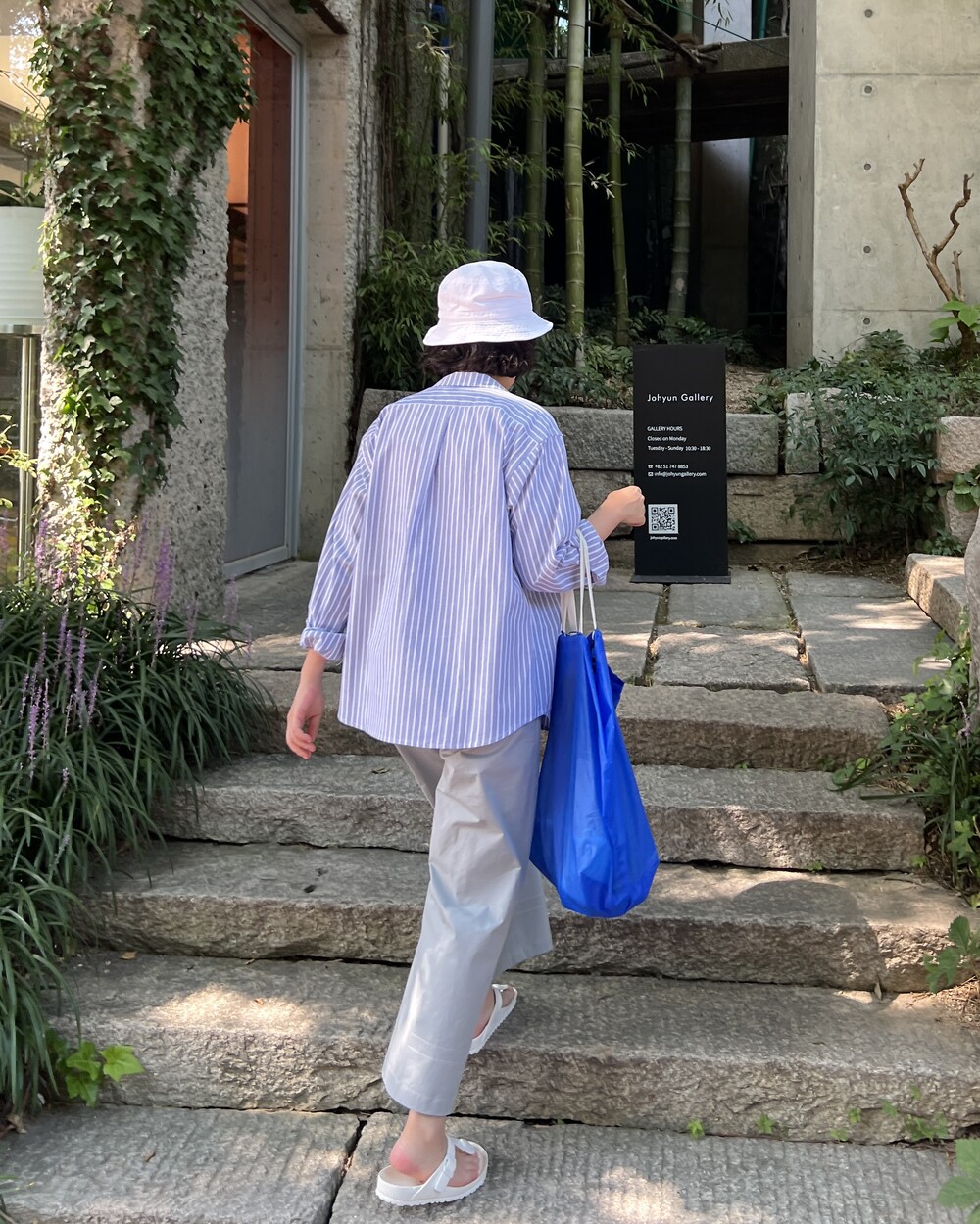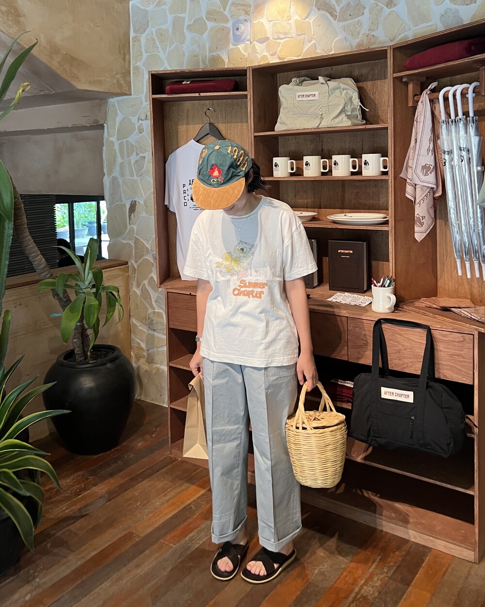 버킷 햇에 셔츠랑 무심하게 🫶🏻 쓱 입어주기 좋은 팬츠예요. 여기저기 정말 편안하게 입을 수 있는, 베이스로서의 역할을 잘 해주는 느낌이었어요.