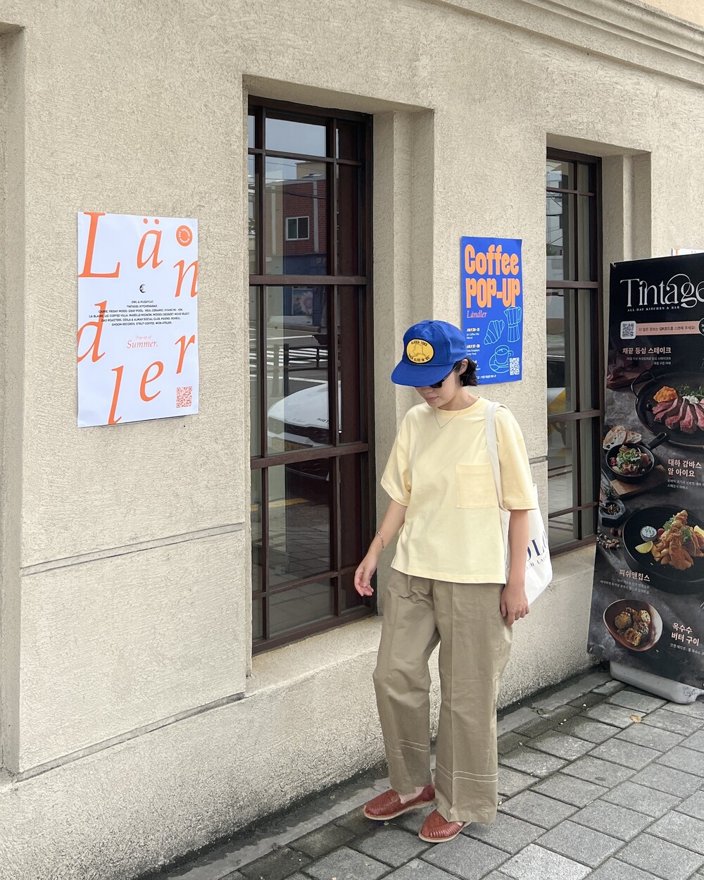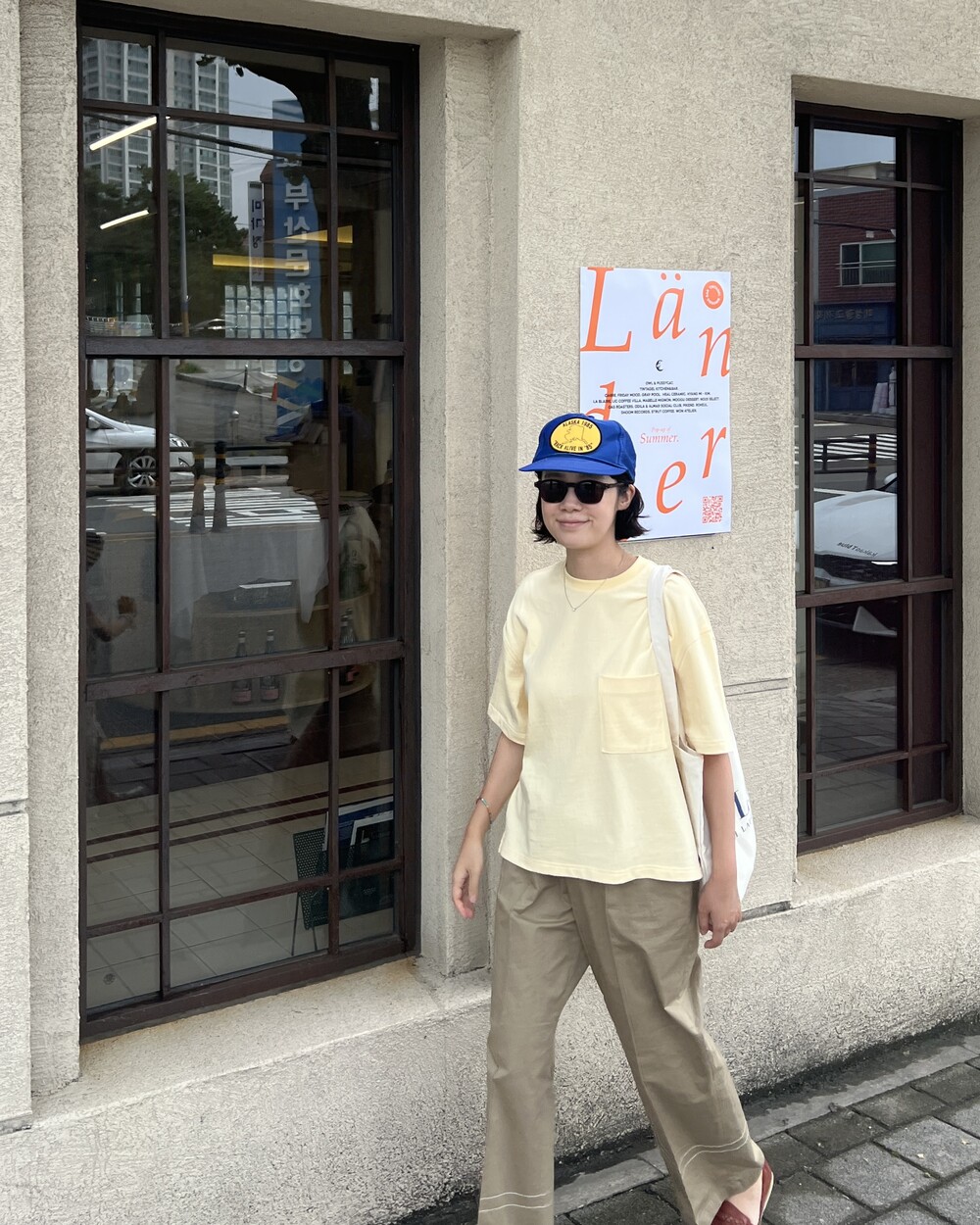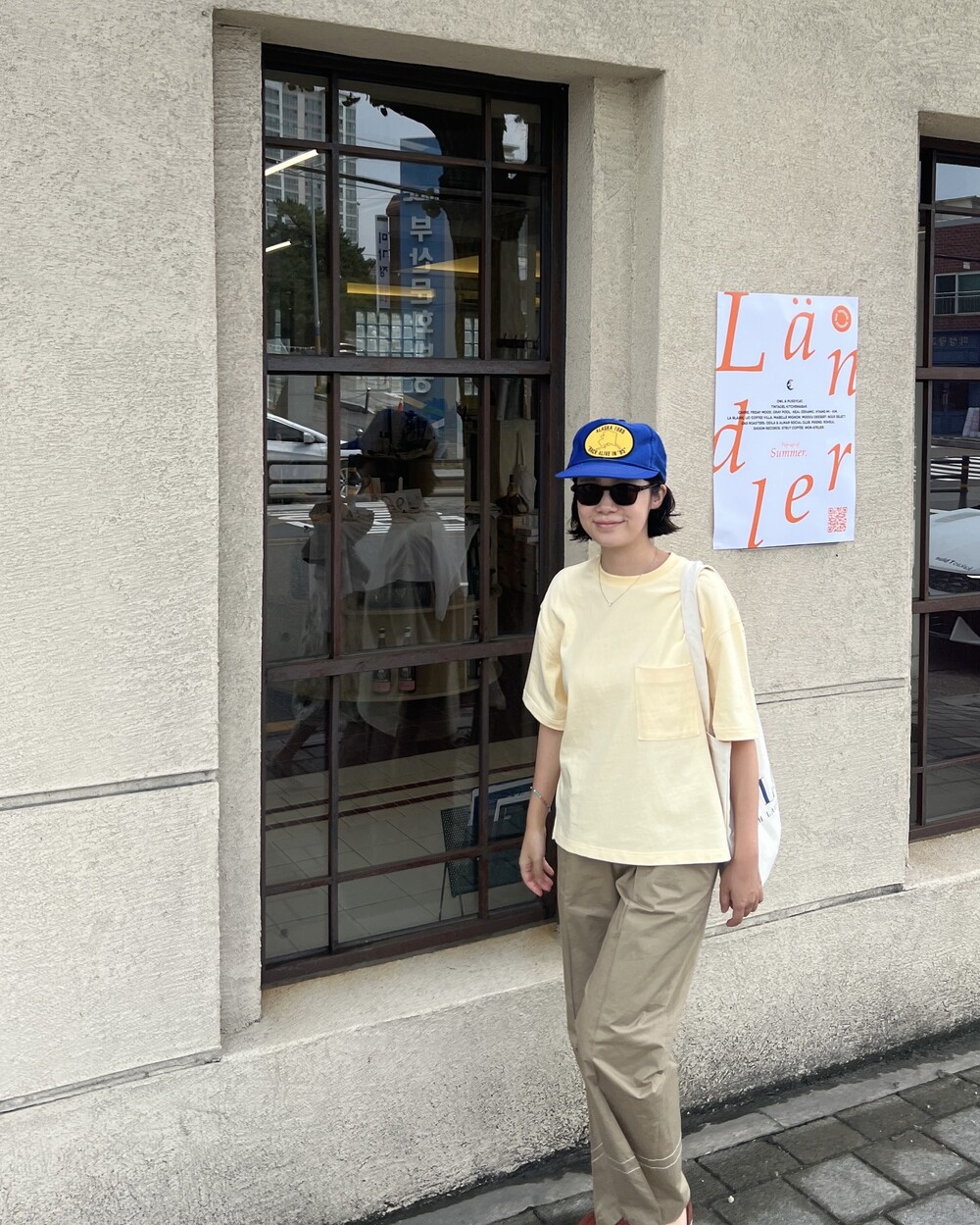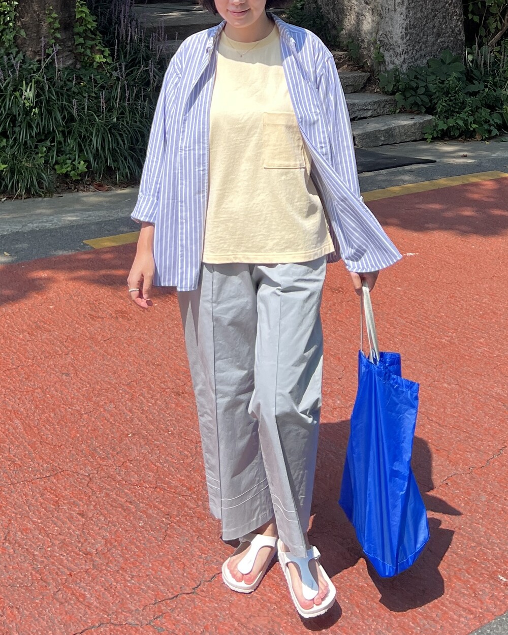 색감이 은은해서 그런지 파스텔톤 상의들이랑 잘 어울렸어요. 티셔츠는 출시 예정 버터 컬러인데 이렇게 두 아이템을 함께 입으면 예쁘더라고요.