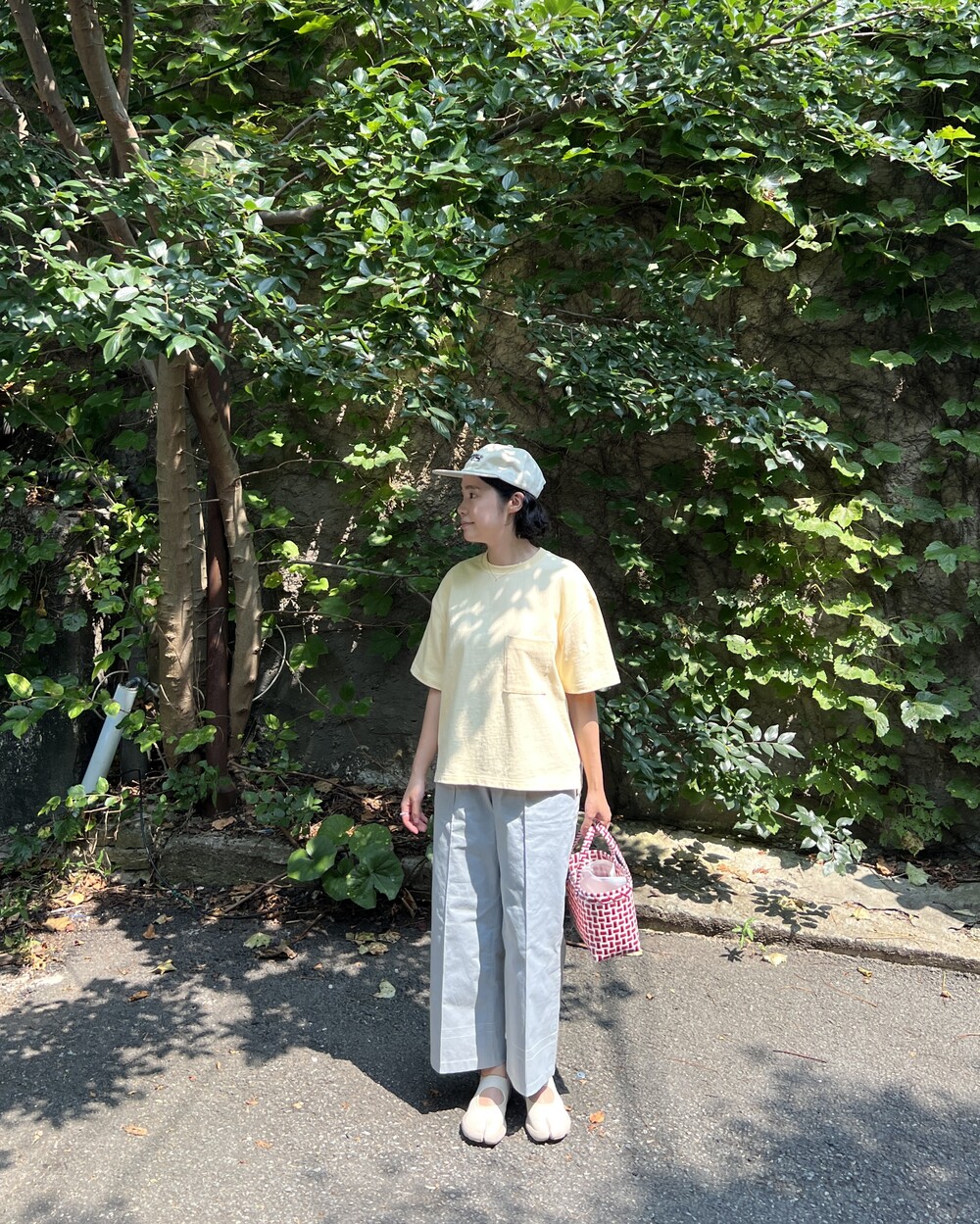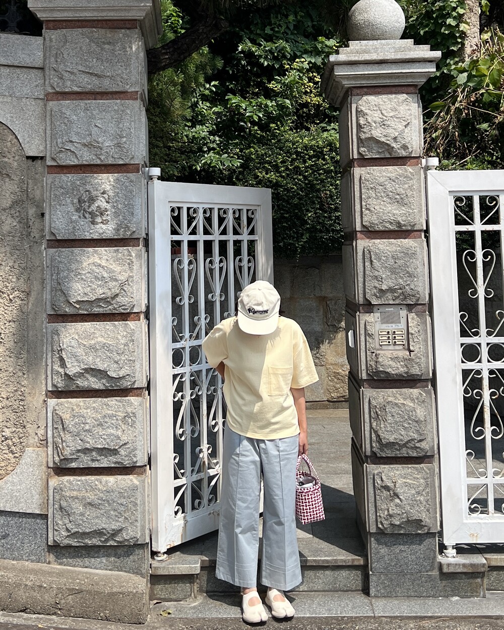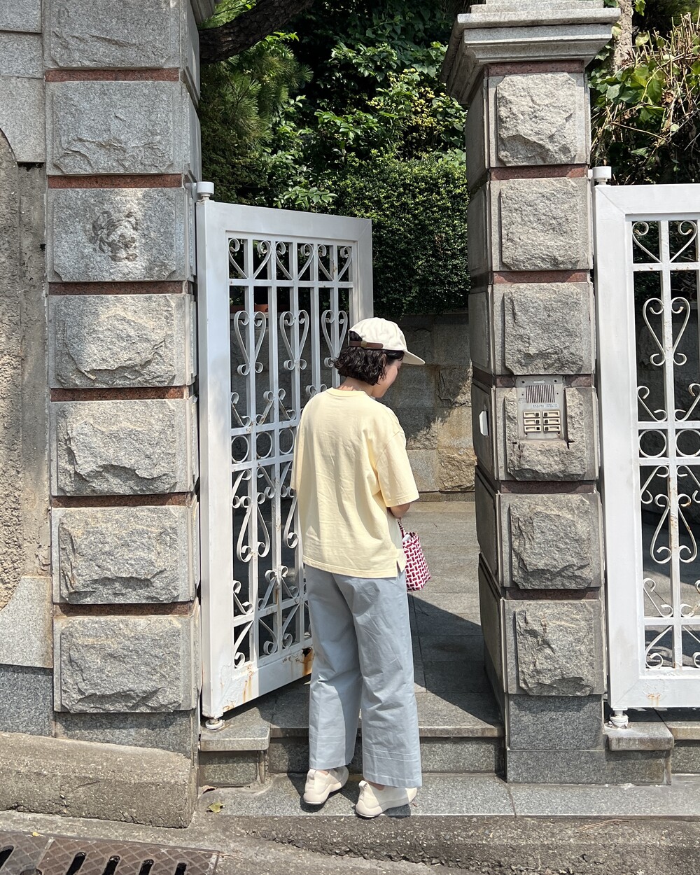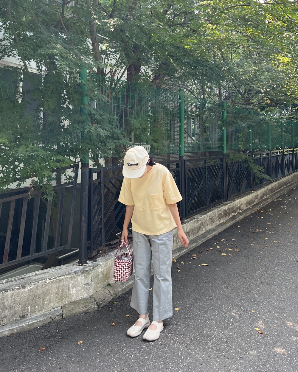 색감이 은은해서 그런지 파스텔톤 상의들이랑 잘 어울렸어요. 티셔츠는 출시 예정 버터 컬러인데 이렇게 두 아이템을 함께 입으면 예쁘더라고요.