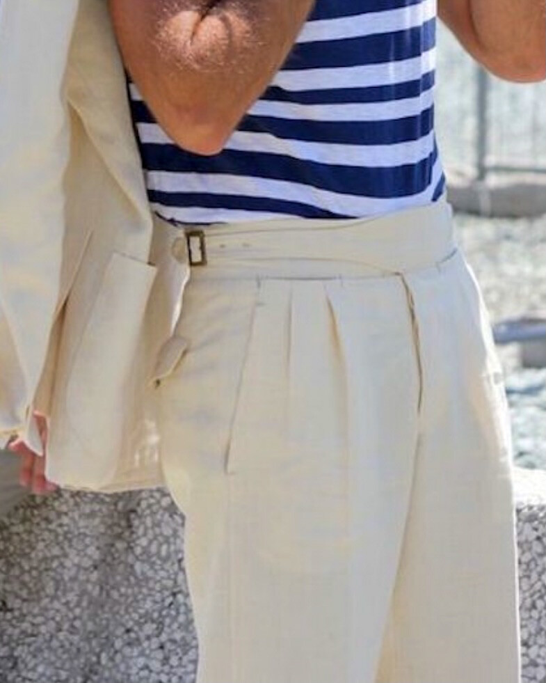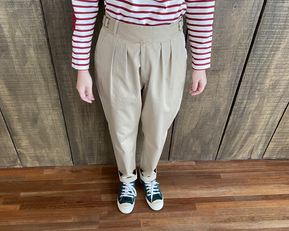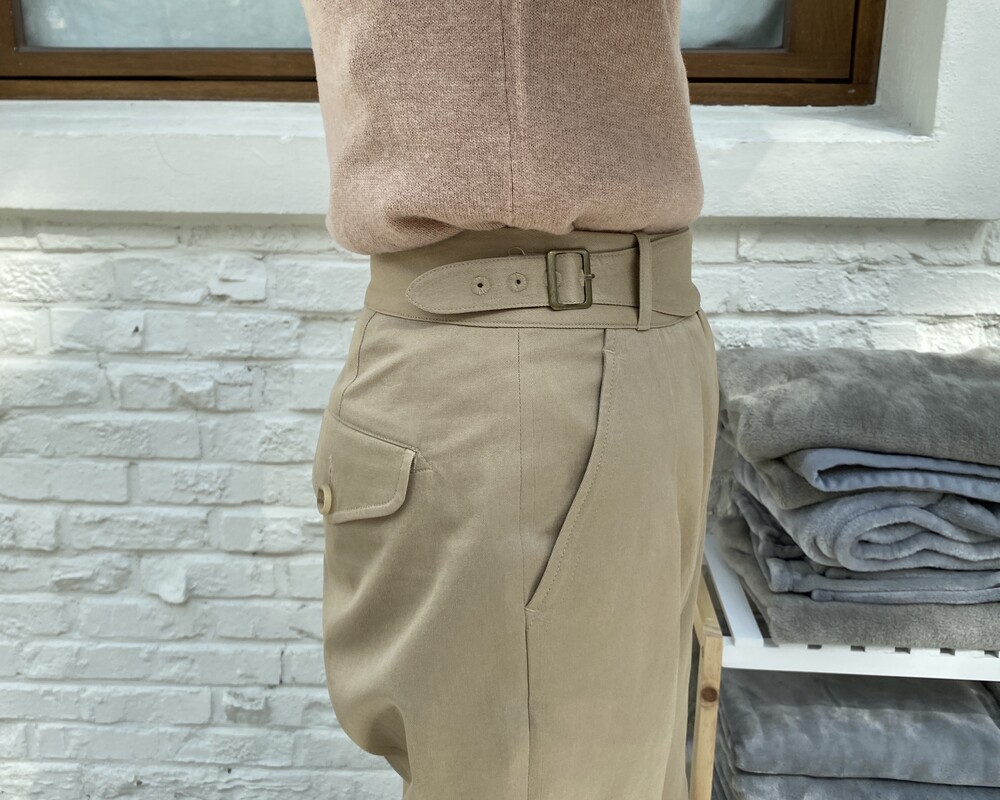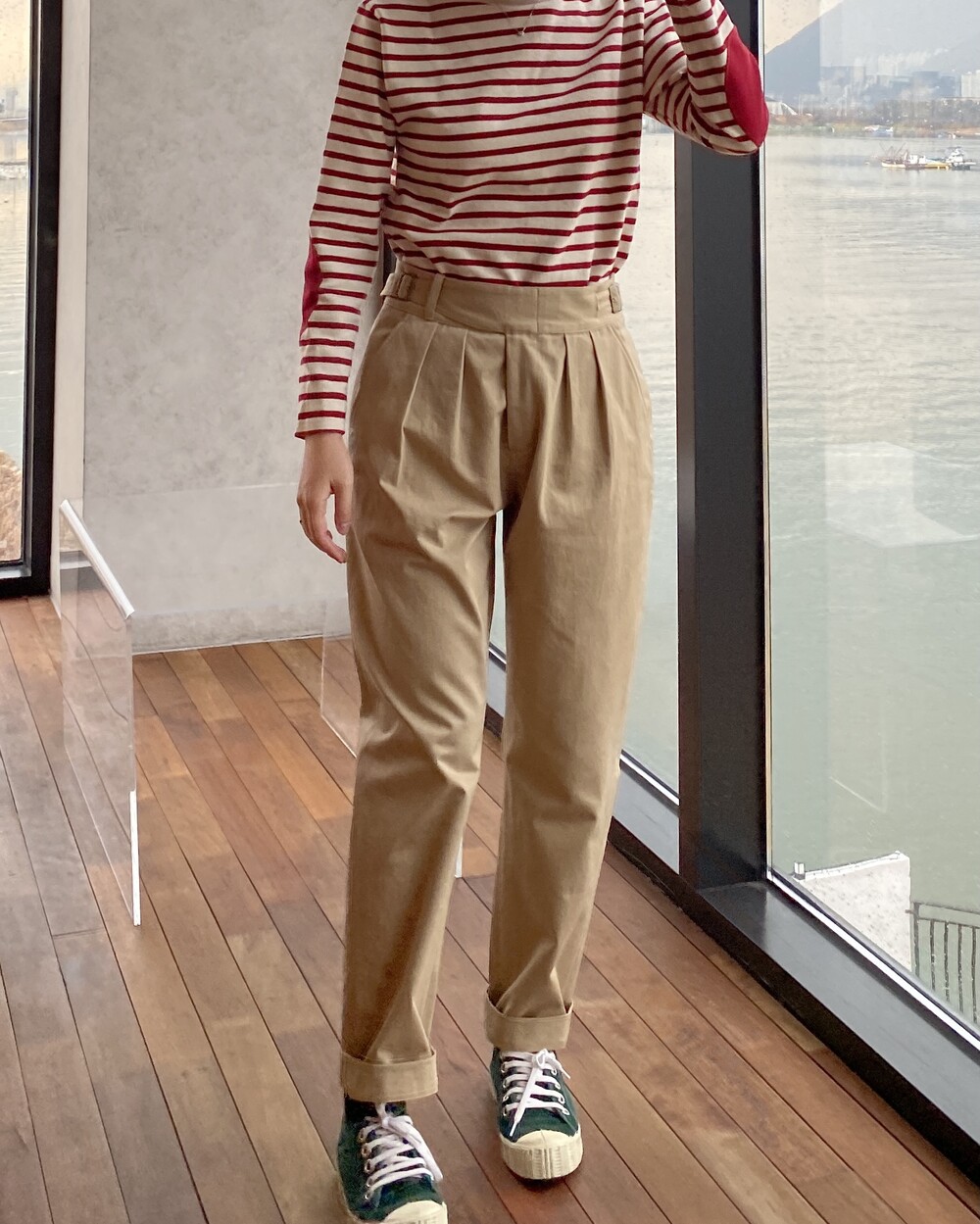허리 부분에 버클 디테일이 있어서 기본적으로 허리 사이즈가 넉넉한 편이고 버클을 이용해서 허리에 맞게 조절해서 입는 스타일이에요.